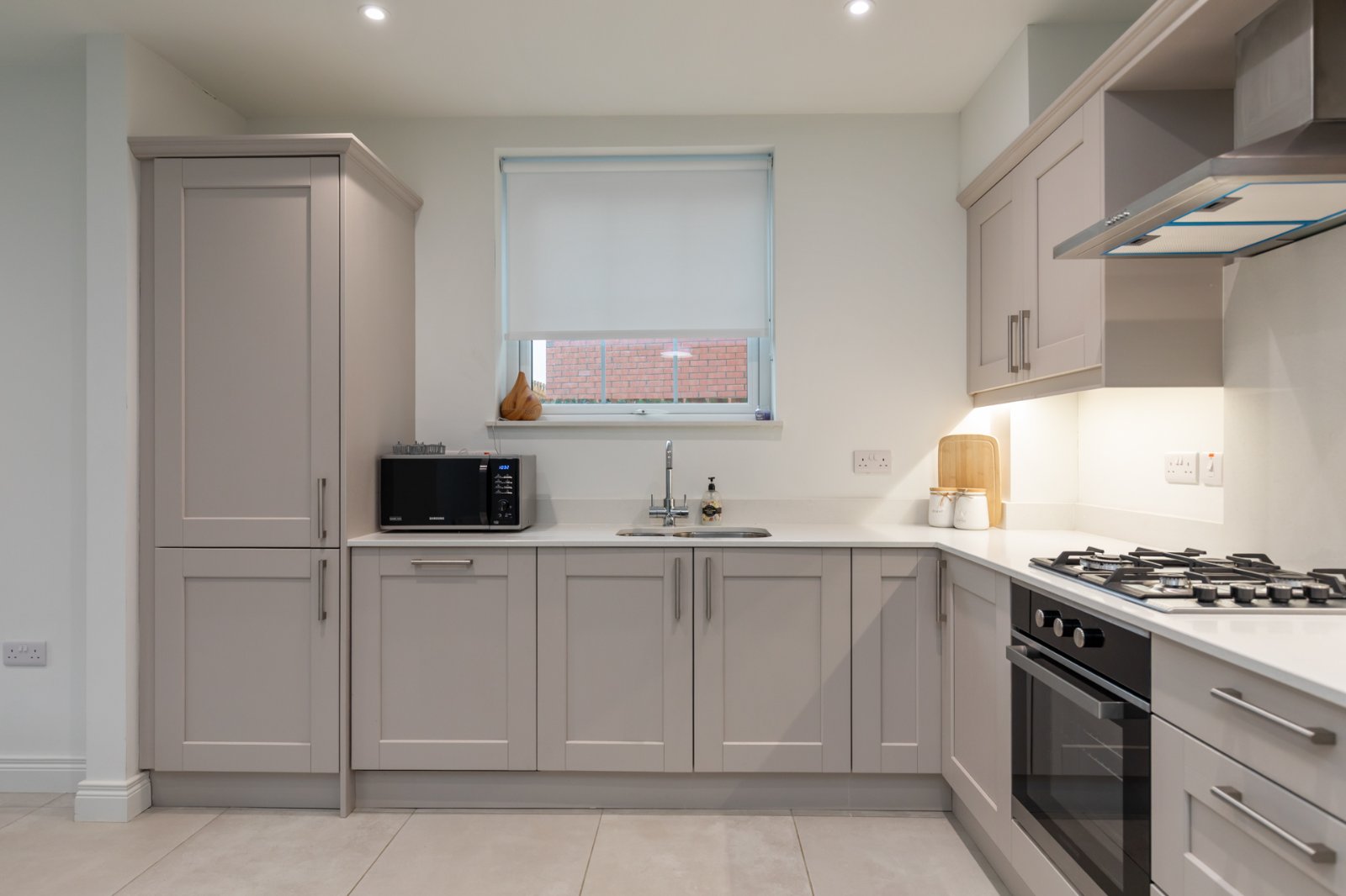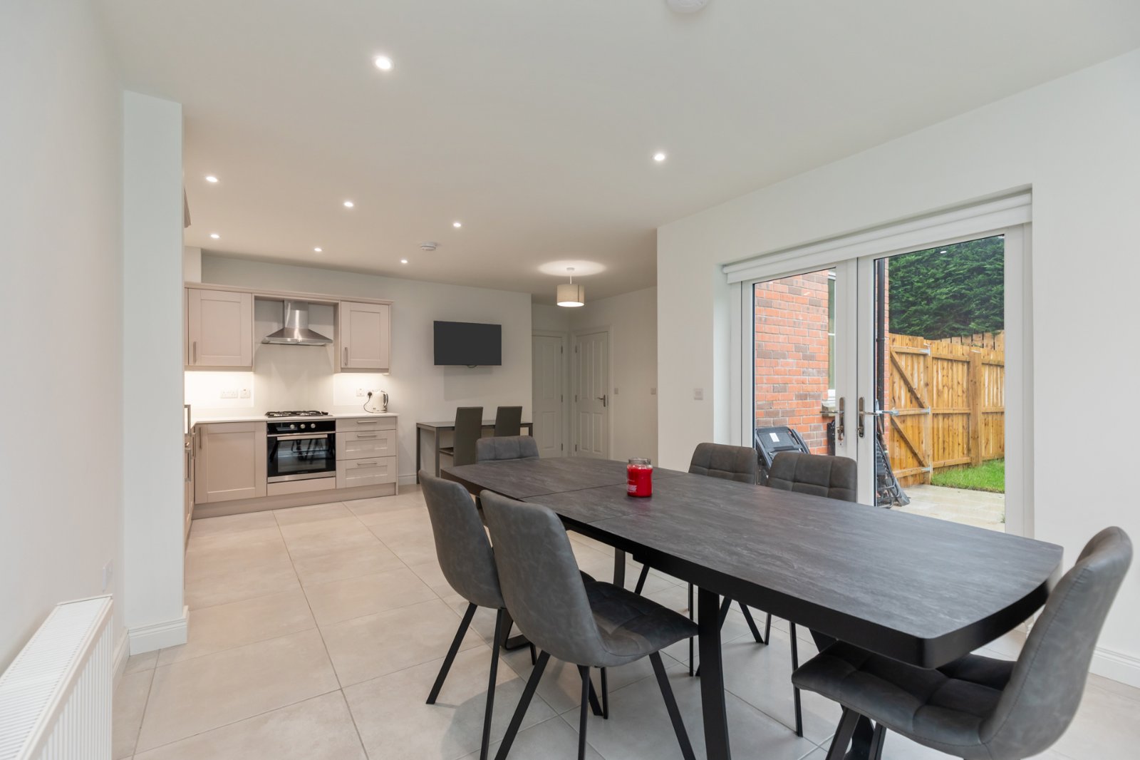 Contemporary kitchen with excellent range of units, work surfaces and extensive range of integrated appliances. Feature tiling and lighting. Open to: