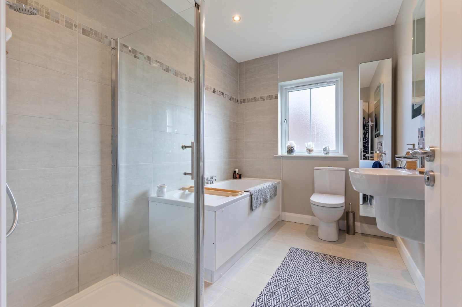 Ceramic tiled floor, low flush WC, pedestal wash hand basin, bath with tiled wall, fully tiled shower cubicle, chrome heated towel radiator, spotlighting