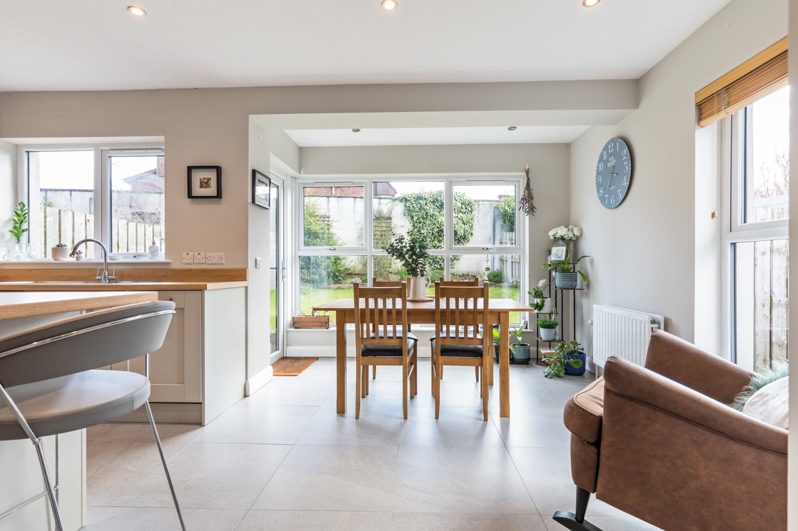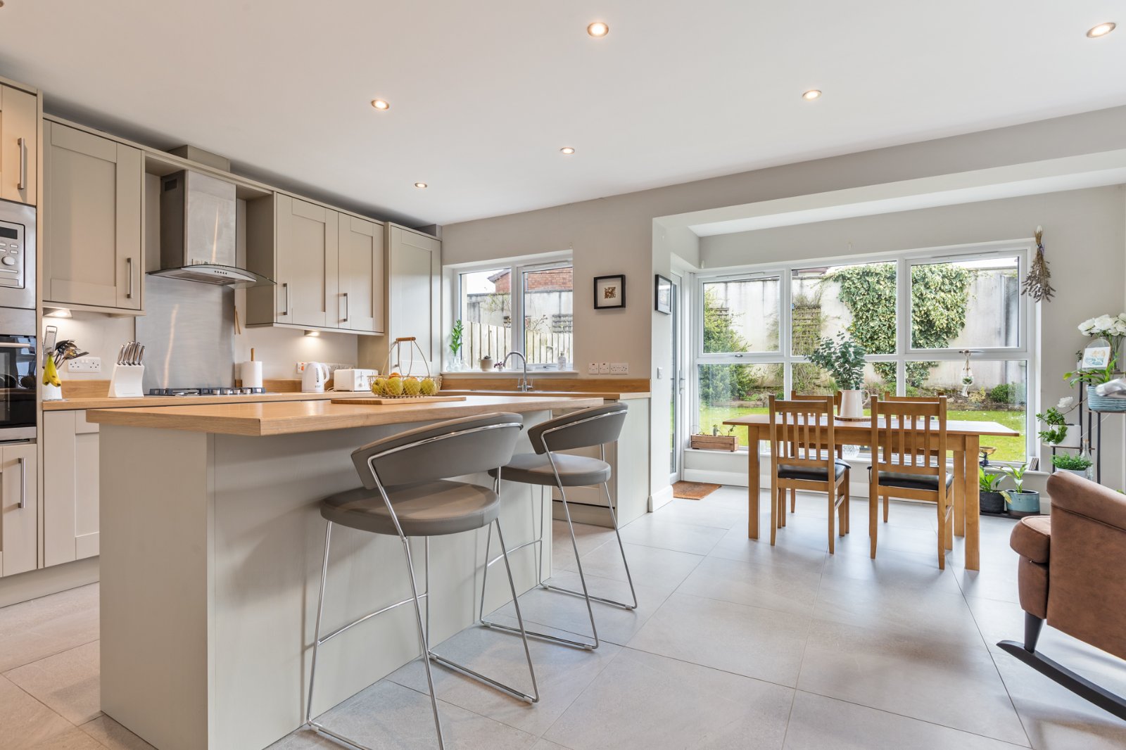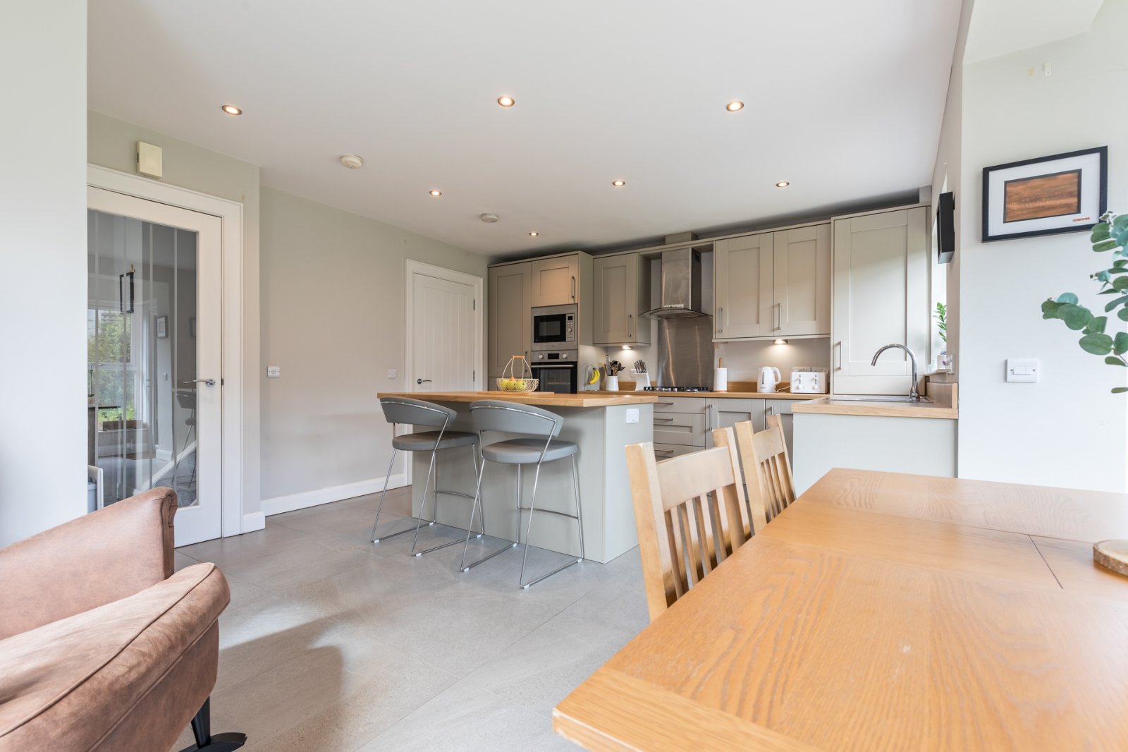 Ceramic tiled floor, spotlighting, range of high and low level units, integrated fridge freezer, electric oven, microwave, 4 ring gas hob, glass and stainless steel extractor fan, 1.5 bowl stainless steel sink unit, integrated dishwasher, Ideal gas boiler, centre island, integrated washing machine, uPVC double glazed door leading outside