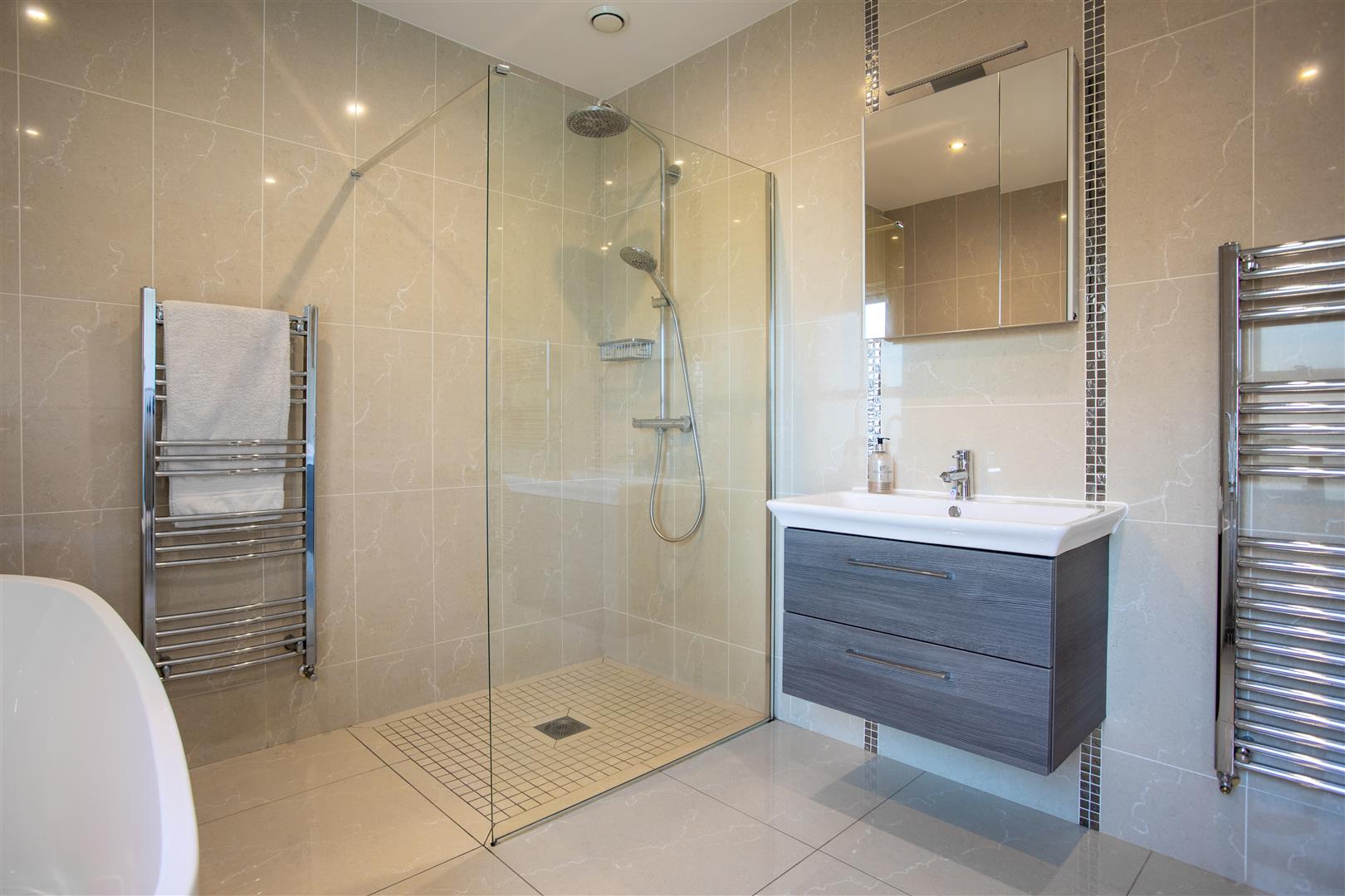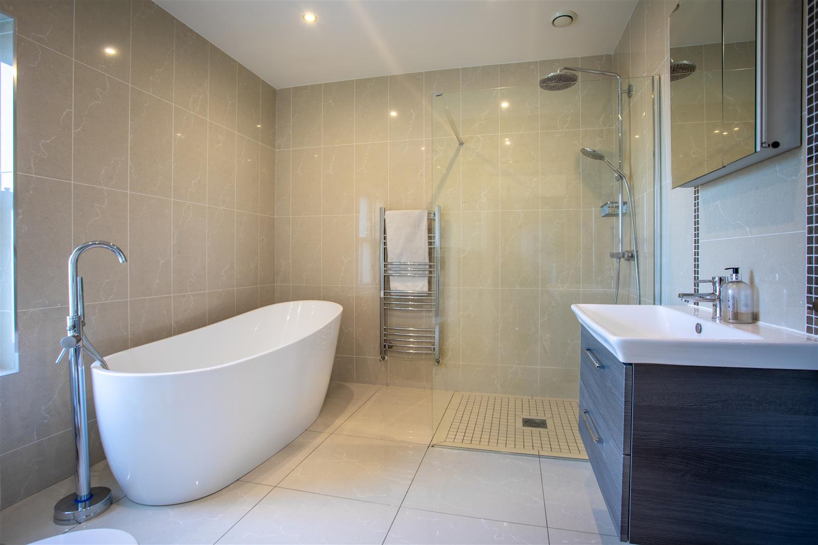 Contemporary white suite comprising free standing bath with floor mounted chrome mixer tap with adjustable shower head; tiled shower cubicle with thermostatically controlled shower; glass shower panel; floating vanity unit with fitted wash hand basin and chrome mono mixer tap; illuminated mirror over; wc with concealed cistern; porcelain tiled floor and ceiling; LED spot lighting; extractor fan; chrome heated tower radiator;