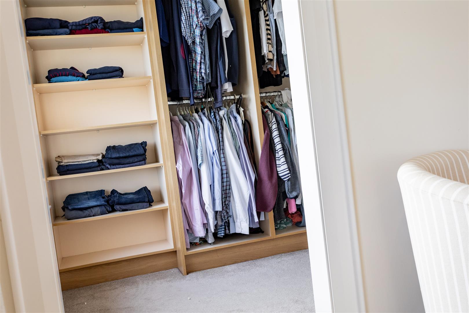 Extensive range of fitted clothes rails, storage shelves and drawers;