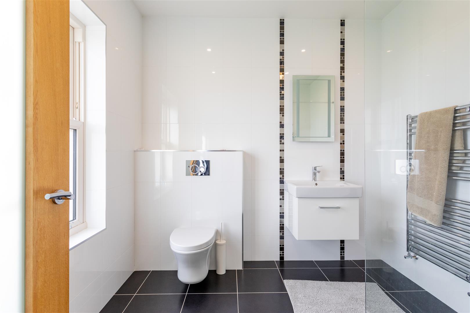Contemporary white suite comprising tiled shower cubicle with 'Hansgrohe' thermostatically controlled shower; glass shower panel; floating vanity unit with fitted wash hand basin and chrome mono mixer tap; drawer under; illuminated mirror over; wc with concealed cistern; porcelain tiled walls and floor; LED spotlighting; extractor fan; chrome heated towel radiator;