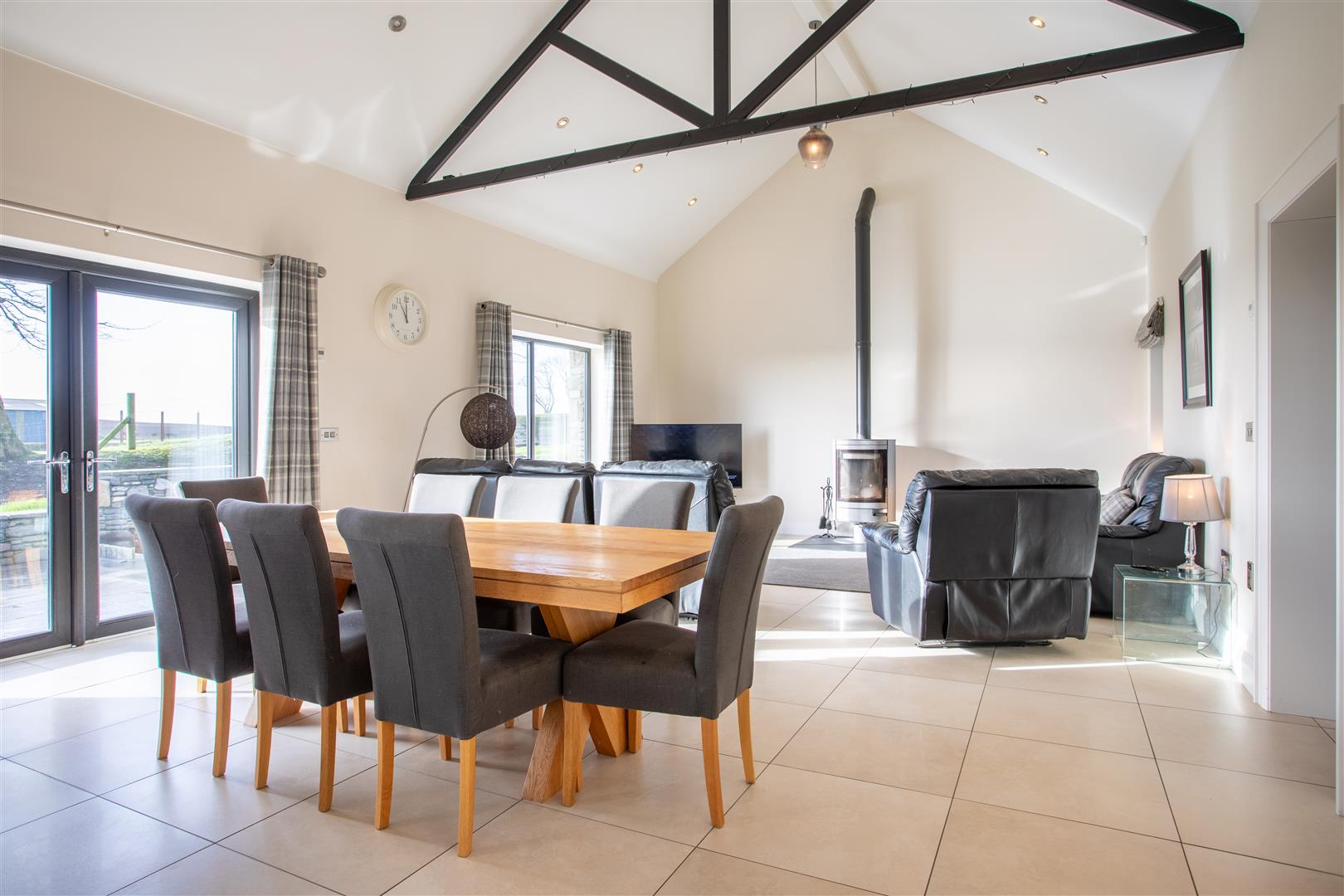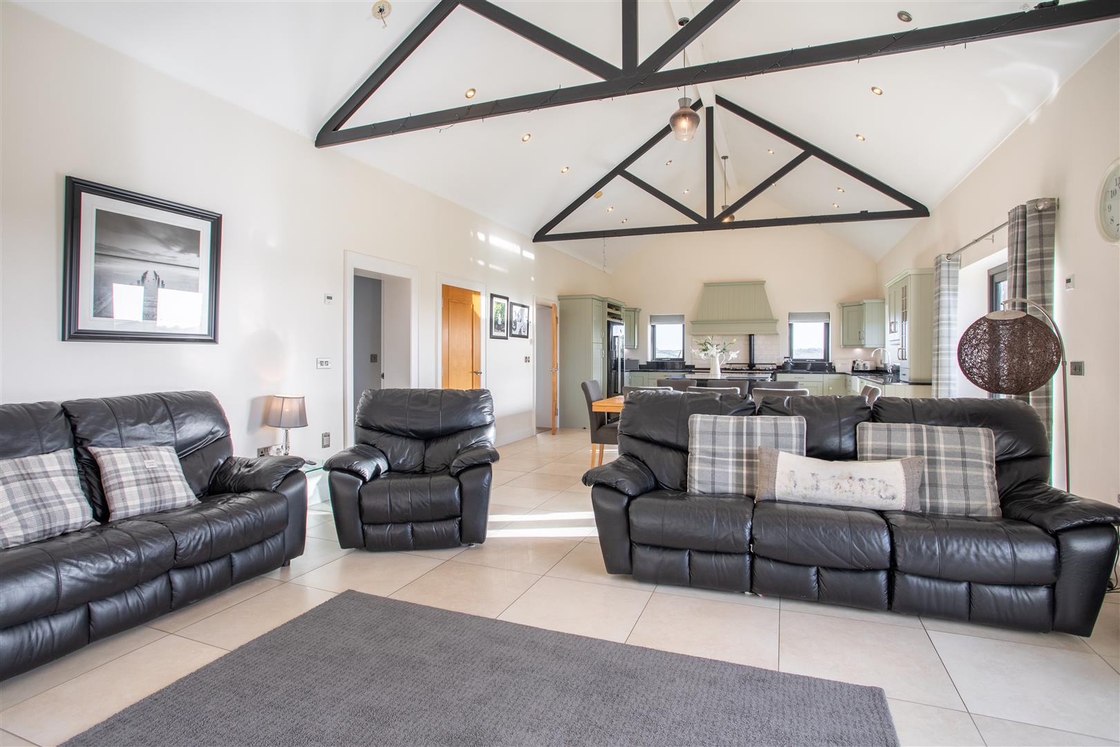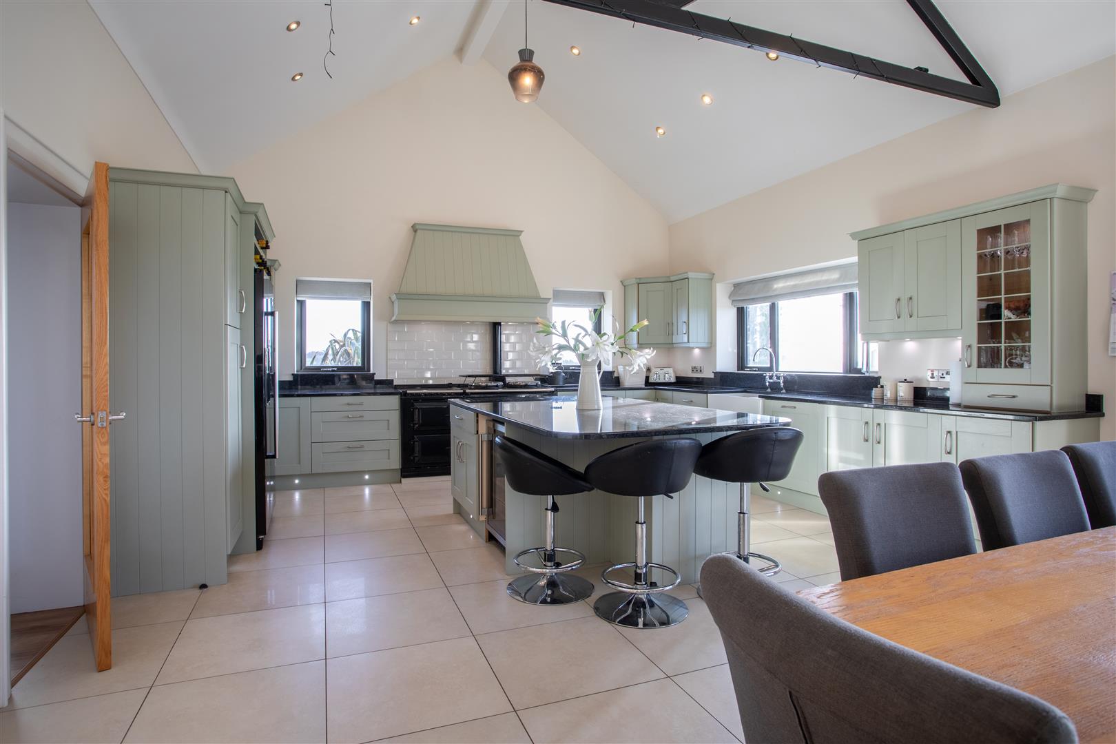 Rangemaster double ceramic Belfast sink with chrome mixer taps; extensive range of painted finish eye and floor level cupboards and drawers; matching display cupboard and wine rack; polished black granite worktop; island unit with range of fitted cupboards and drawers and waste bin drawer; integrated 'Bosch' microwave and 'CDA' wine fridge; integrated black oil fired and electric four oven aga; dishwasher; porcelain flagged floor; freestanding enclosed cast iron stove on slate hearth; feature 'A' frame timber beamed vaulted ceiling; built-in storage cupboard;