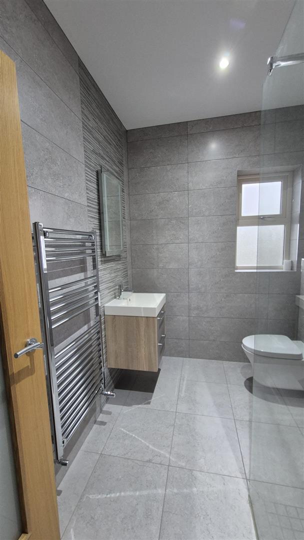 Plumbed for WC porcelain flagged floor; chrome heated towel radiator.