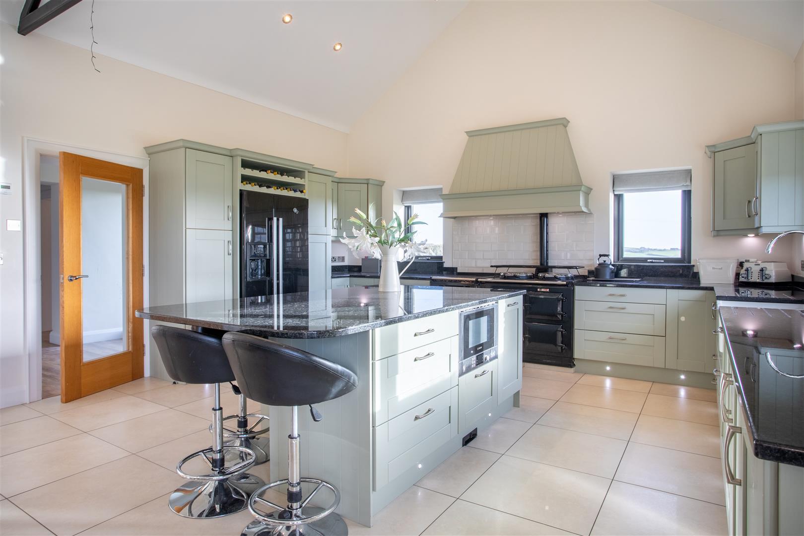 Rangemaster double ceramic Belfast sink with swan neck mixer taps; extensive range of painted finish eye and floor level cupboards and drawers; wine rack; illuminated and glazed display cupboard and wine rack; polished granite worktop; integrated Bosch American fridge and Neff dishwasher; matching island unit with fitted cupboards, drawers and waste bin; integrated 'Bosch' microwave and 'CDA' wine fridge; skirting board vacuum unit; polished black granite worktop and breakfast bar; black 4 oven oil fired AGA with twin hobs, canopy and LED lights over porcelain flagged floor; A frame beamed and vaulted ceiling Romotop enclosed multi fuel cast iron stove on slate hearth; ample TV aerial connections; LED spotlights; glazed double doors to patio; porcelain flagged floor; walk in storage cupboard; partially shelved; porcelain tiled floor.