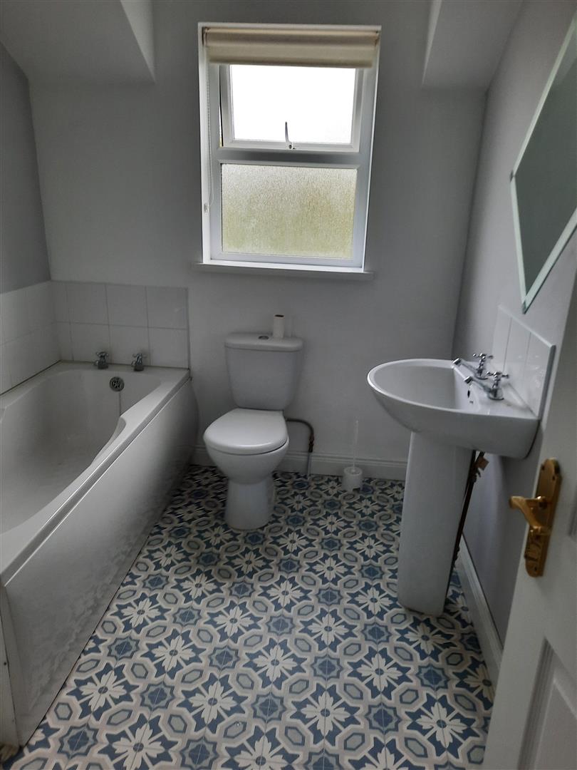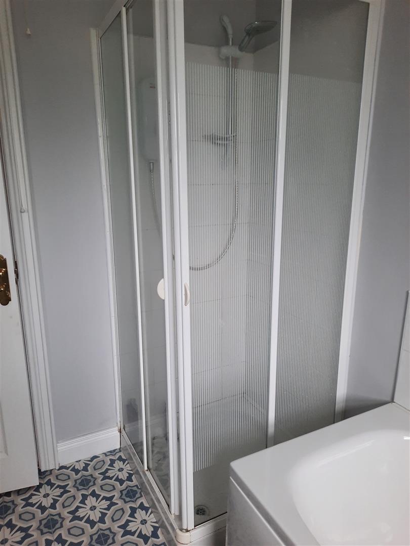 Comprising of tiled walk in shower, bath, WHB, WC.