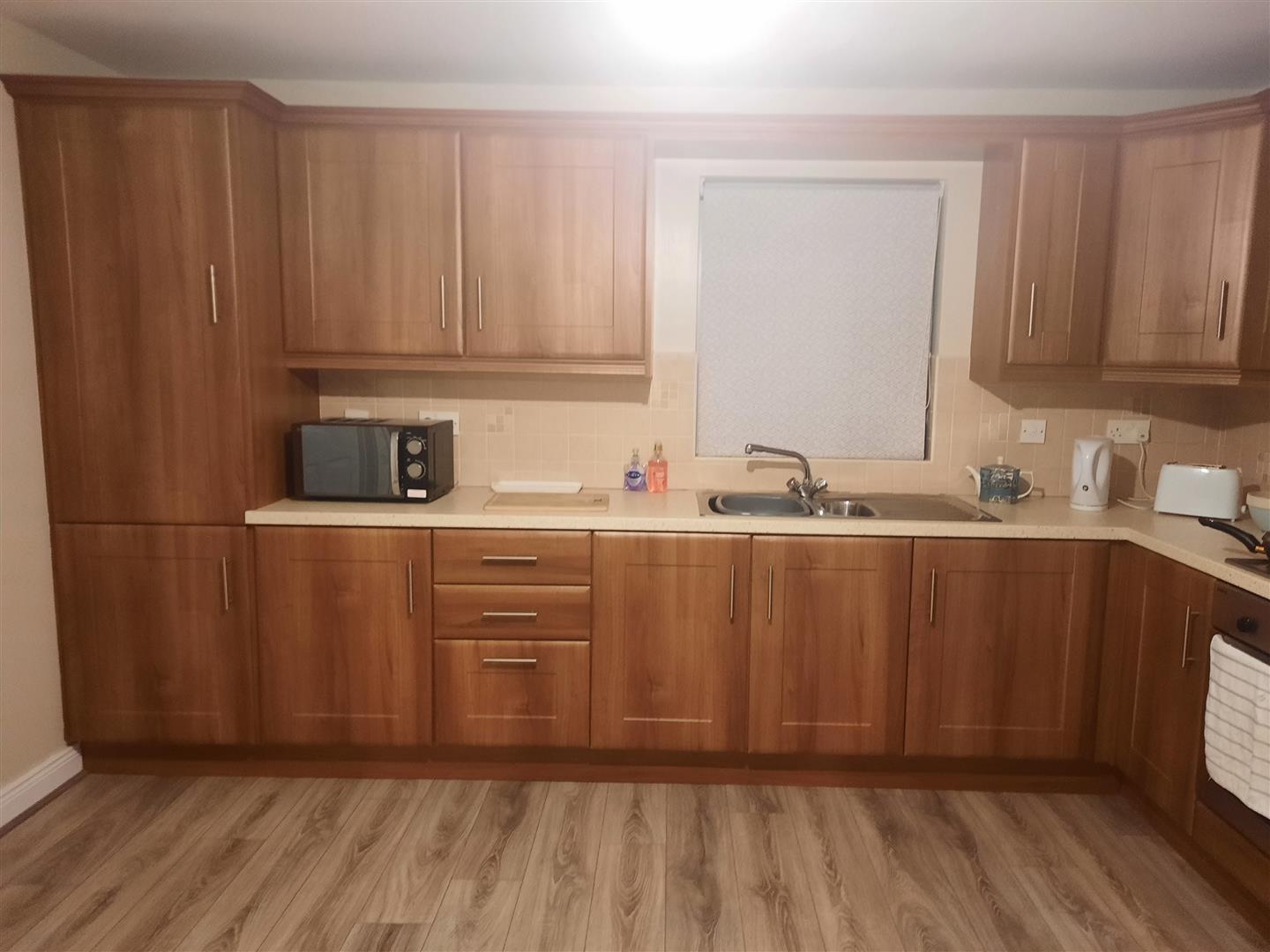 Having range of eye and low level units, tiling between units, 1 1/2 bowl stainless steel sink unit with mixer taps, hob, oven, stainless steel extractor hood, ample dining space.