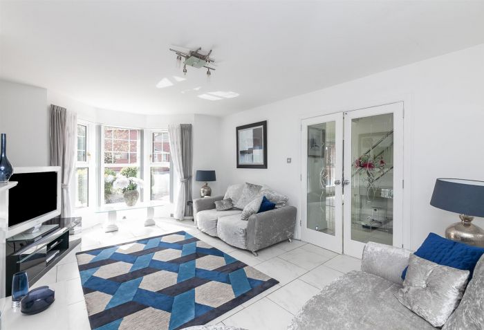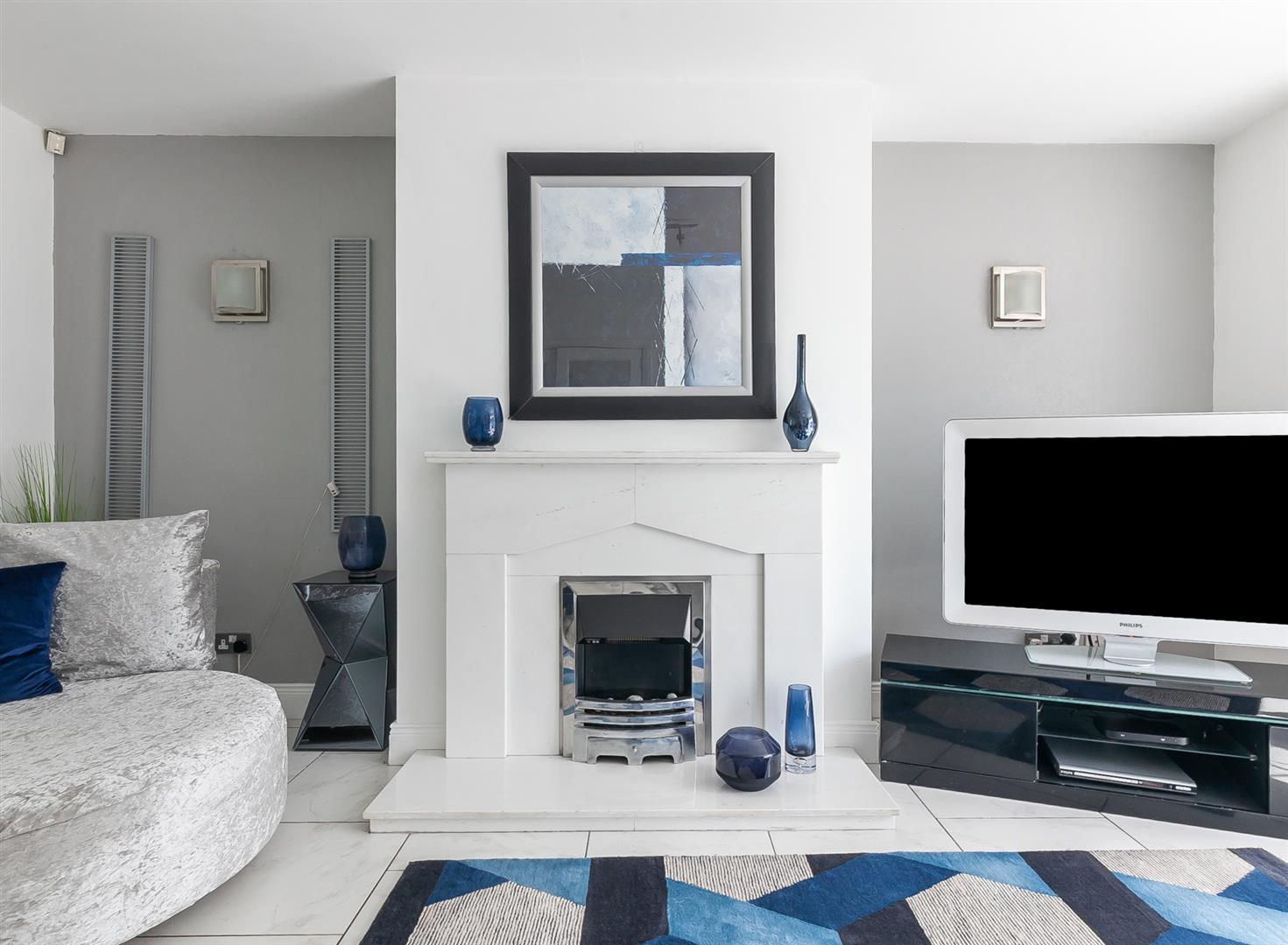 Into the bay window. Feature marble fireplace with raised hearth. Tiled floor.