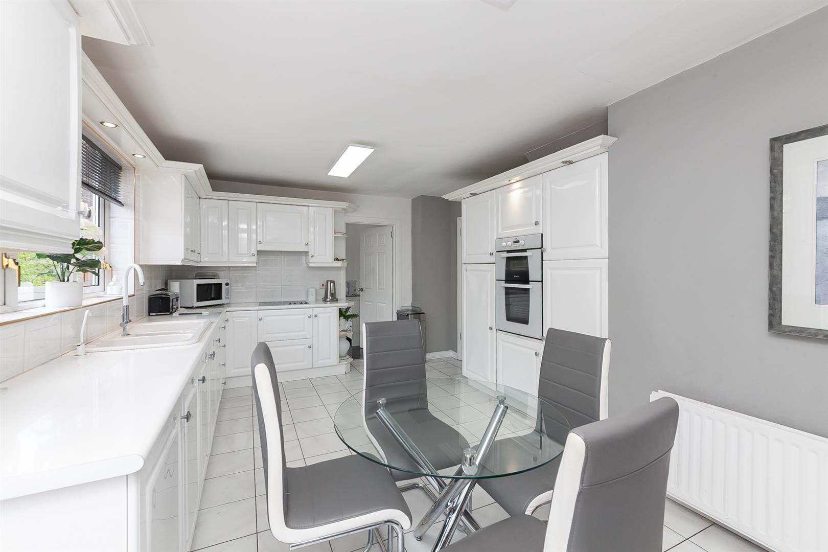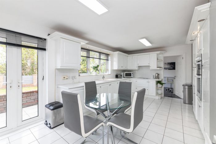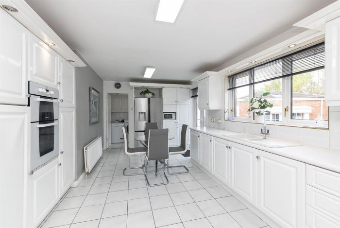 Full range of high and low level units, single drainer sink unit with mixer taps, formica work surfaces, 4 ring hob and double oven, integrated fridge freezer, plumbed for American fridge freezer, tiled floor. Open to casual dining area. French doors to the rear gardens.