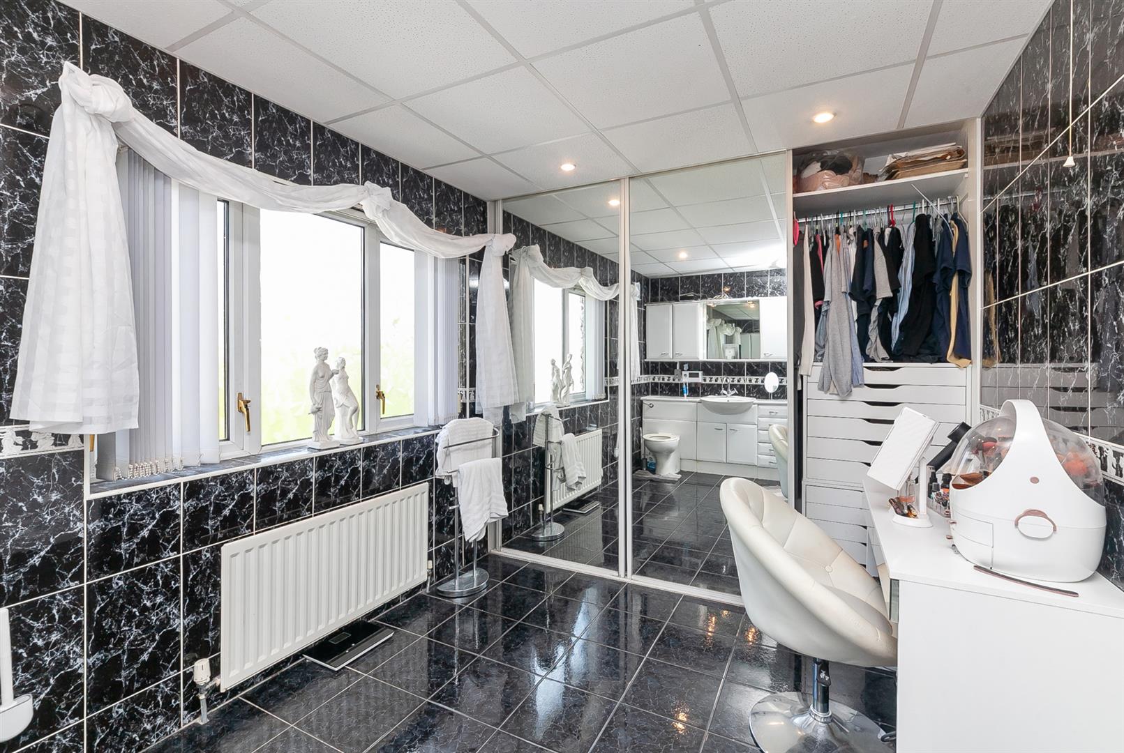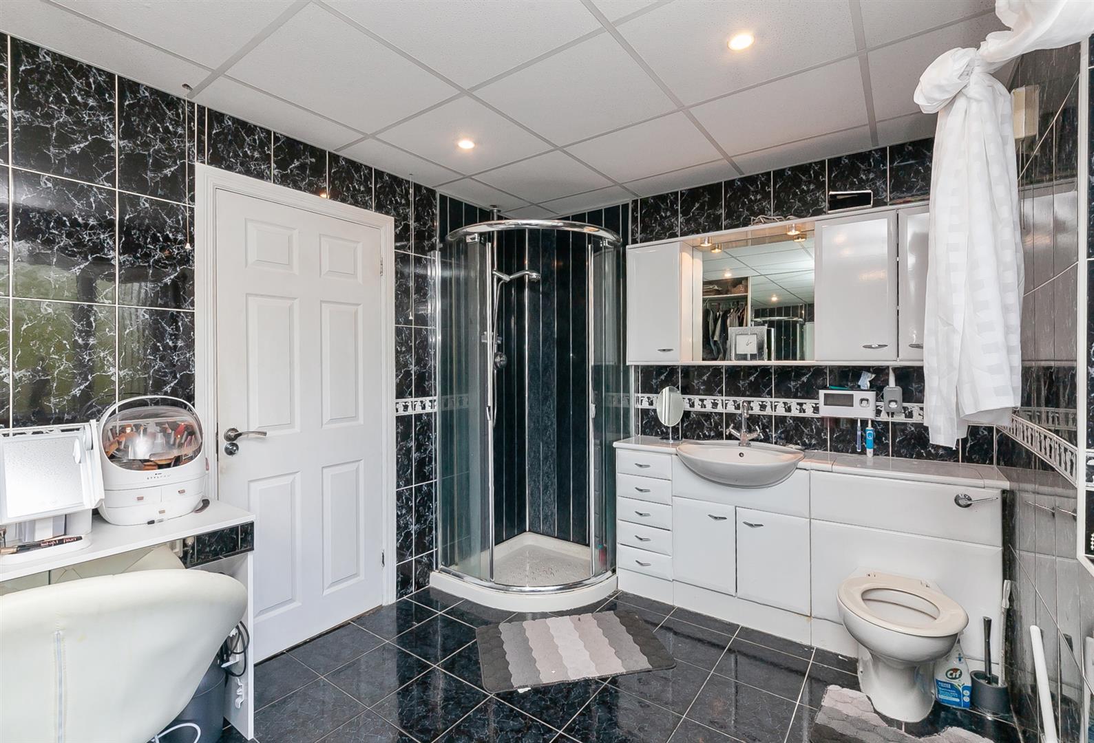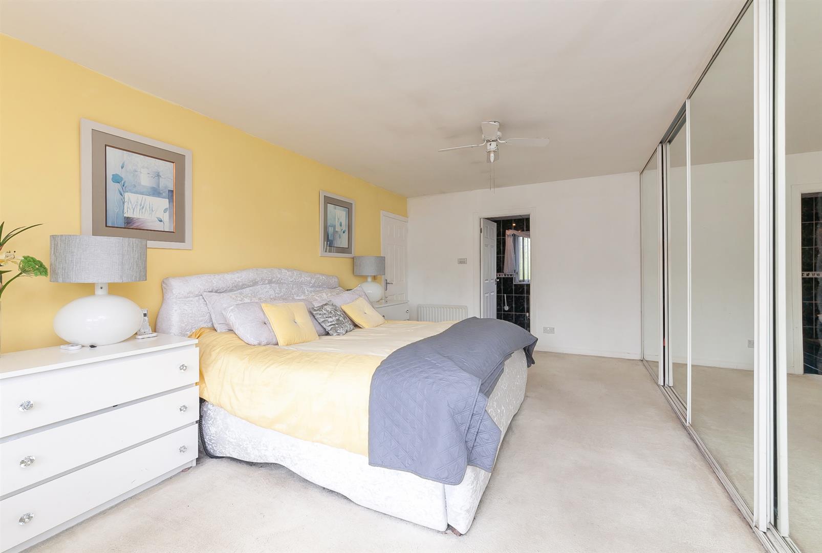 Large en-suite comprising corner shower cubicle with thermostatically controlled shower, wash hand basin with storage below, low flush w/c, fully tiled walls, tiled floor, sliding robes, recessed spotlights.