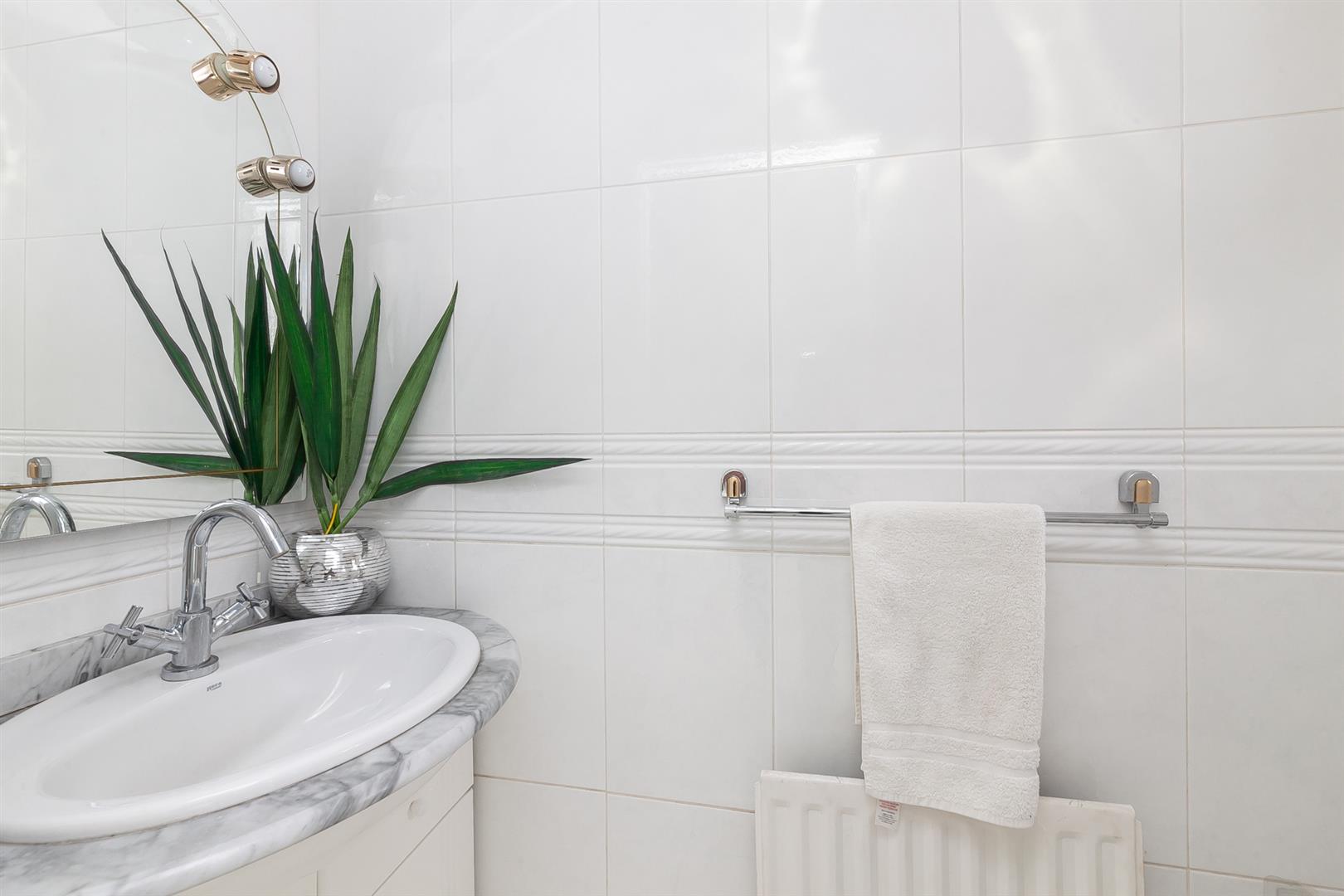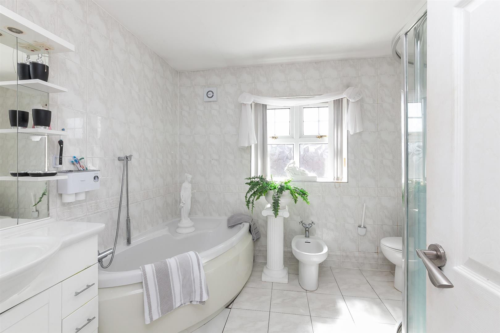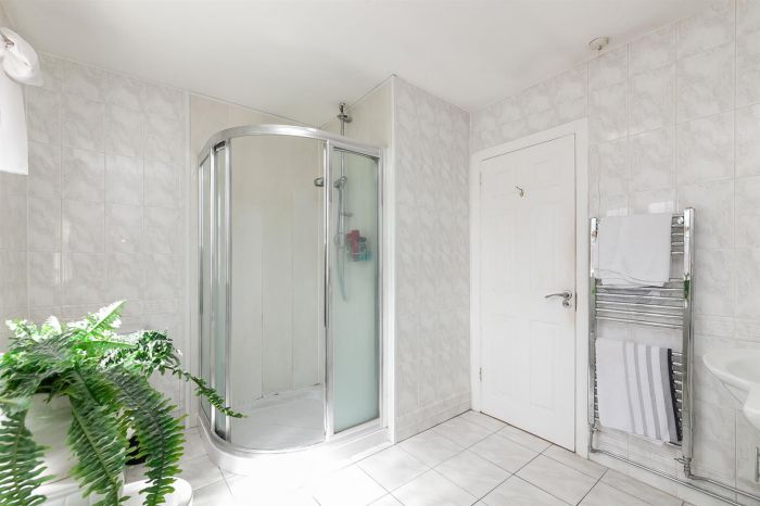 White suite comprising panelled bath, mixer taps, telephone hand shower, low flush w/c, wash hand basin with storage below, corner shower cubicle with thermostatically controlled shower, fully tiled walls, extractor fan, chrome towel radiator. Tiled floor.