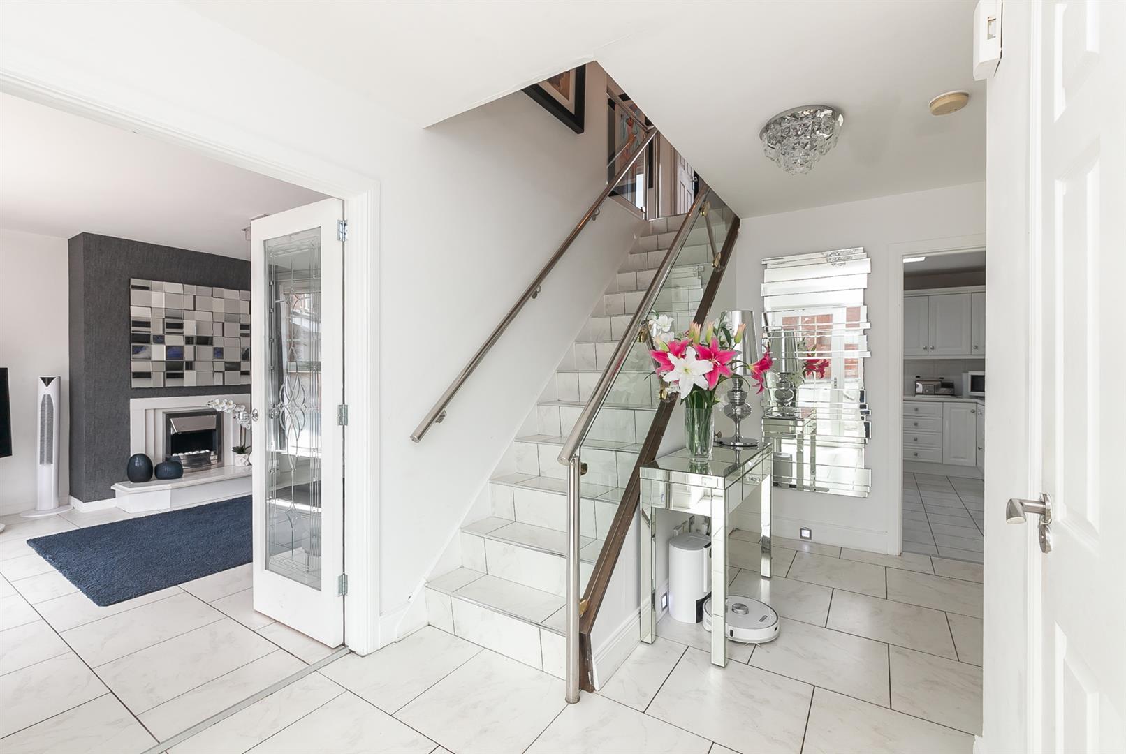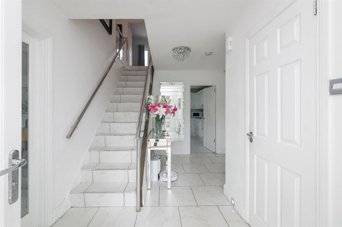 Tiled floor, skirting board lighting. Cloaks area under the stairs.