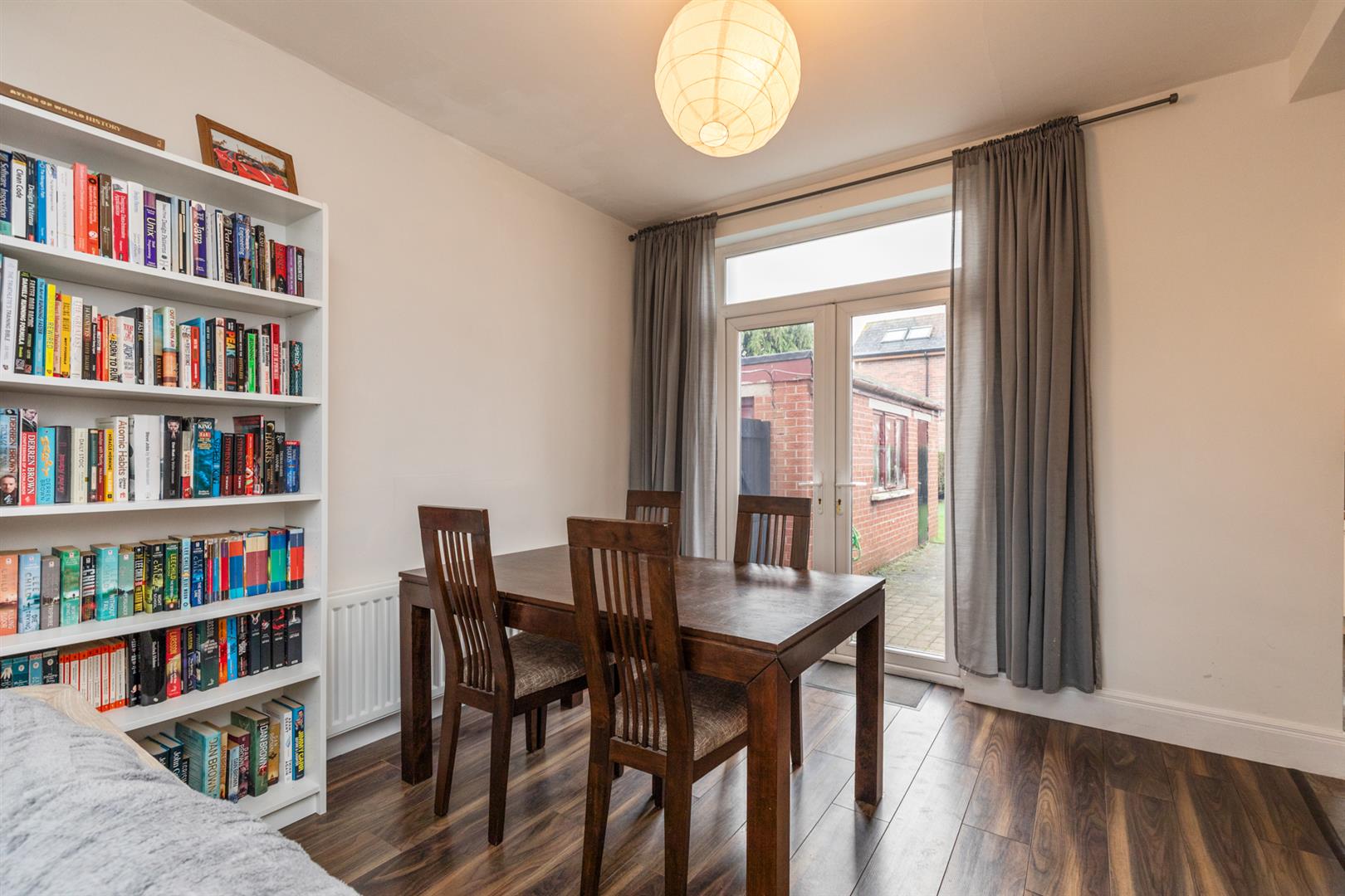 Laminate wooden flooring, attractive cast iron inset fireplace, PVC double doors to rear, open to: