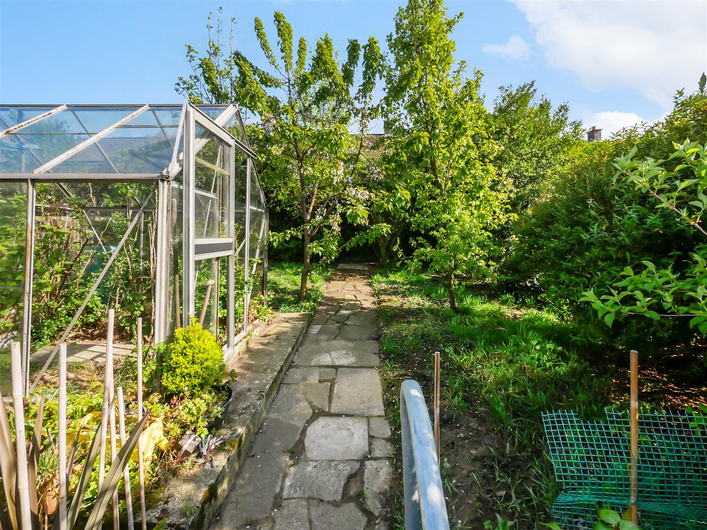 Garden to the rear laid in lawn with an range of fruit trees, flower beds, paved patio area, outhouse storage.