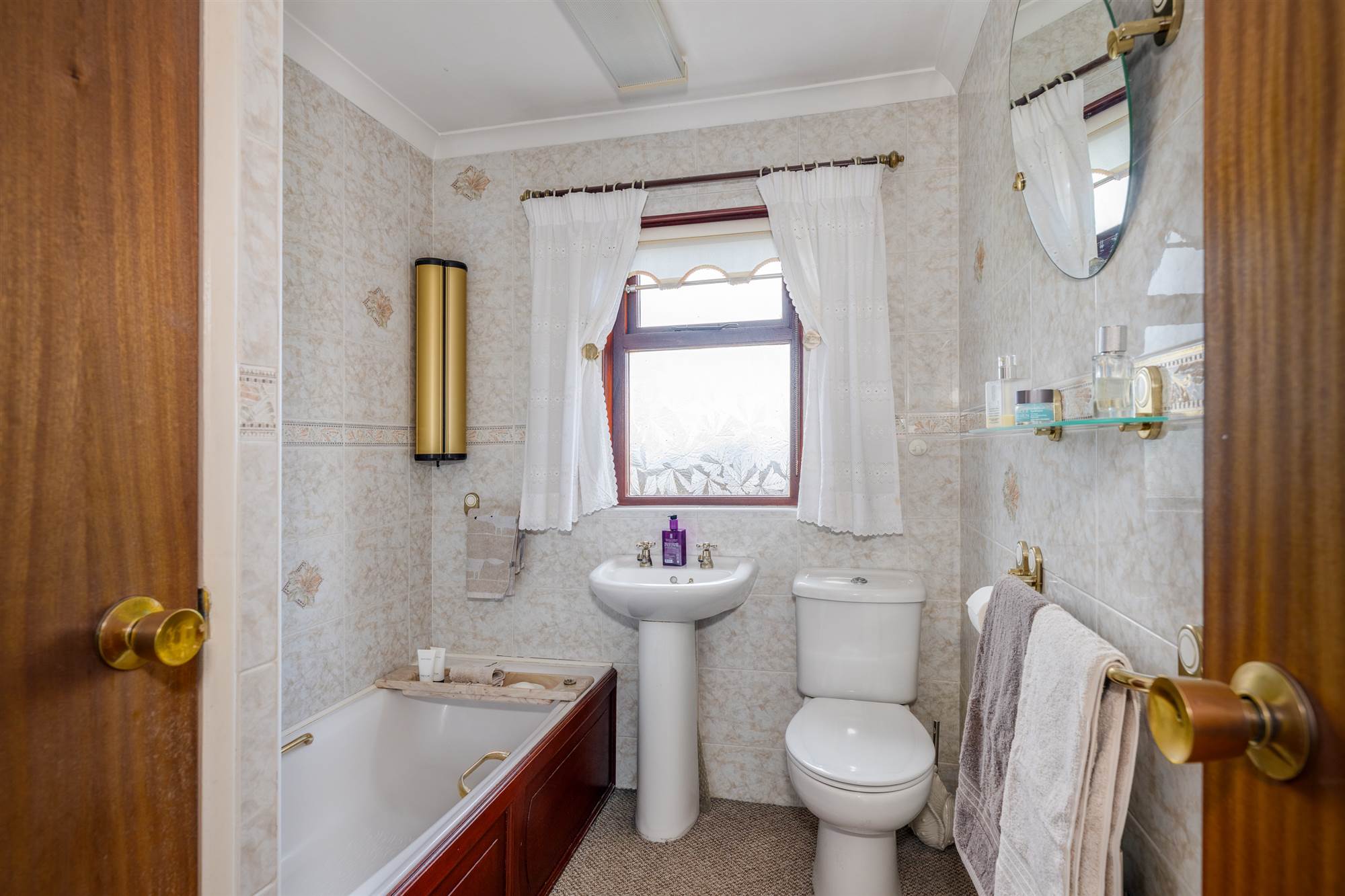 White suite comprising dual flush wc, pedestal wash hand basin, panelled bath, separate Mira thermostatic shower with Shower Lux folding screen. Hotpress cupboard. Fully tiled walls.