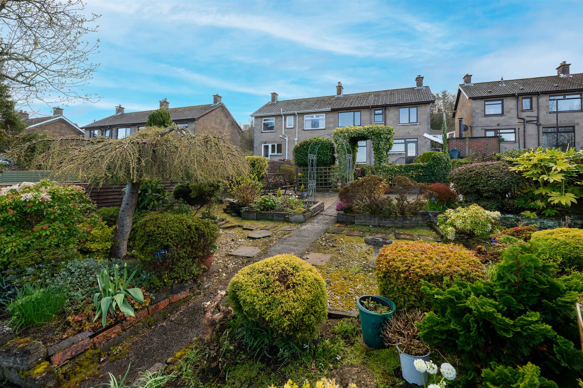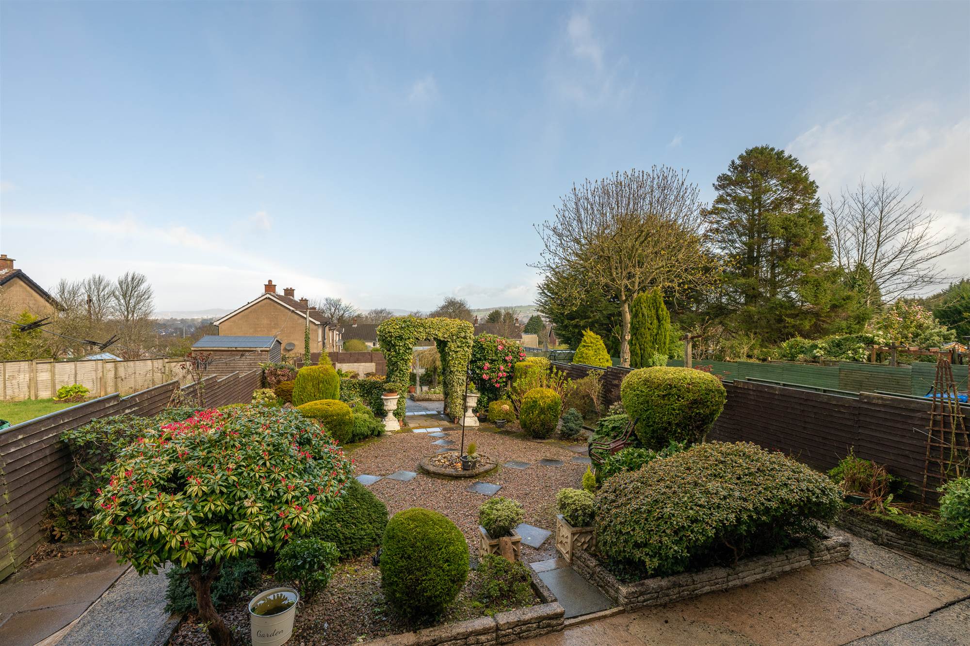 Extensive enclosed rear garden with patio sitting areas, flower beds and mature shrubbery and greenhouse. Storeroom with oil fired boiler. Outside light and tap.