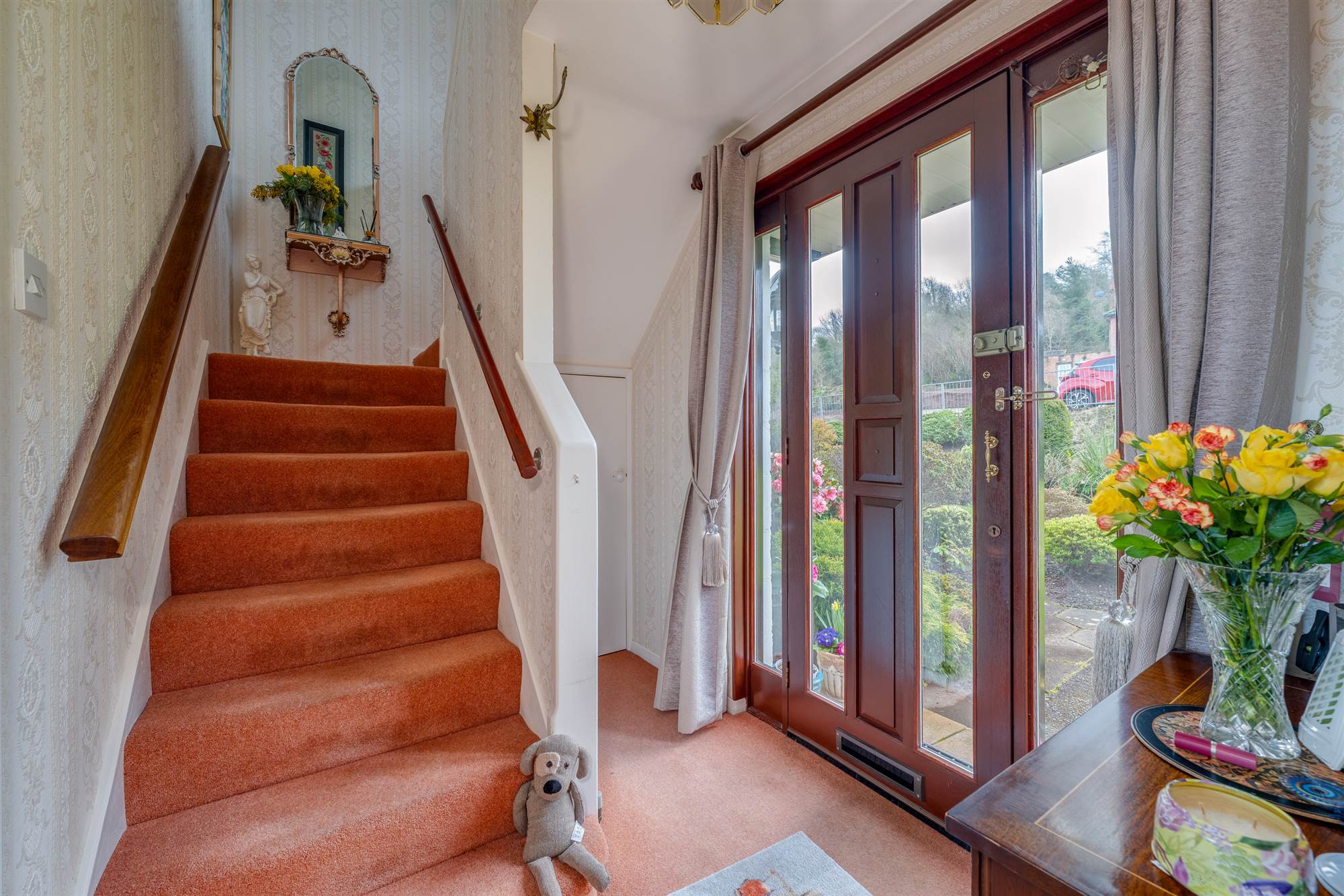 Solid mahogany front door with glazed insets to . . .