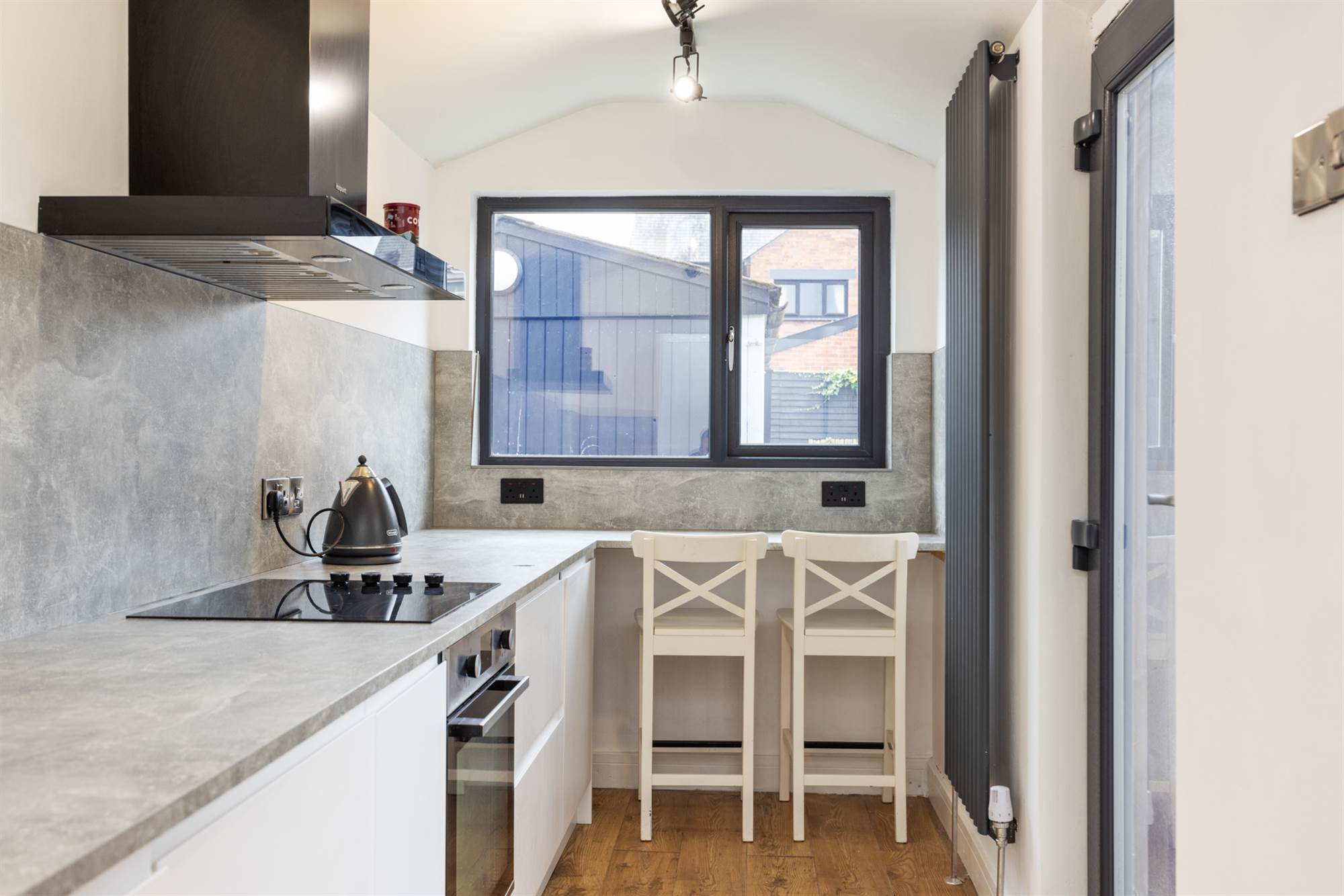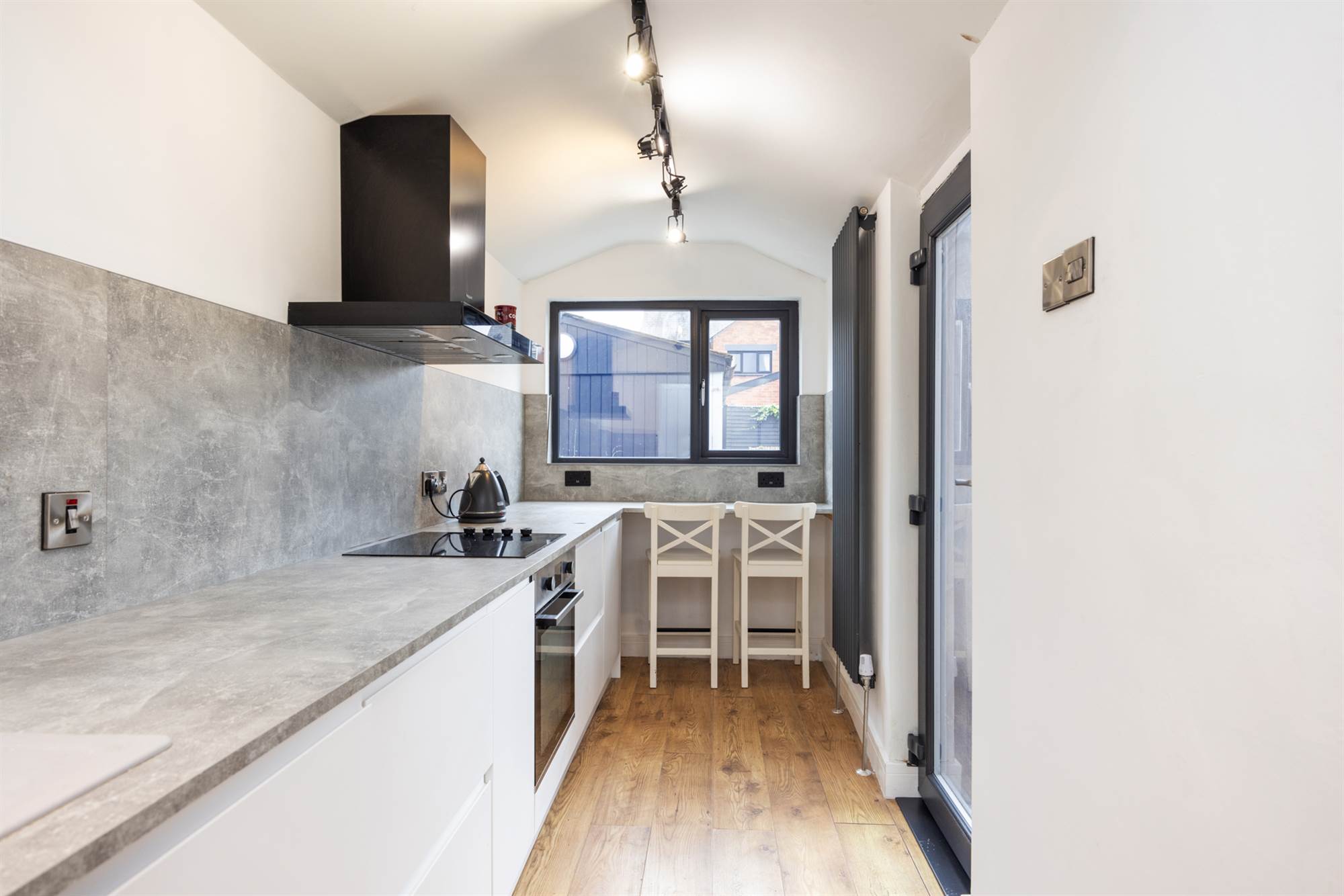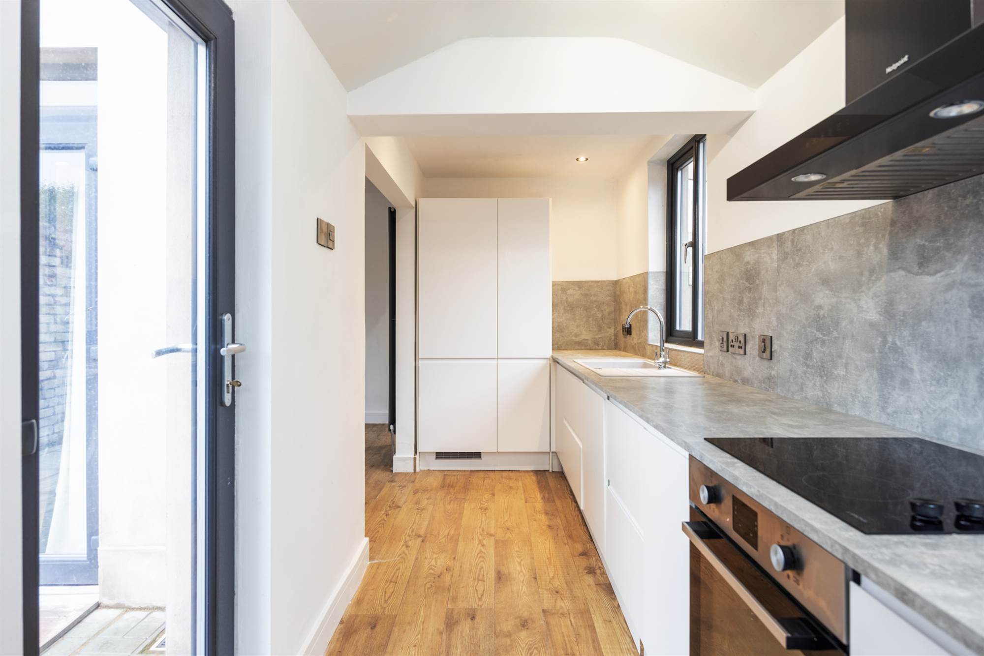 The modern kitchen is open plan to the rear reception which in turn leads out to a good-sized, low maitenance back garden. It enjoys a southerly aspect and is fully enclosed.