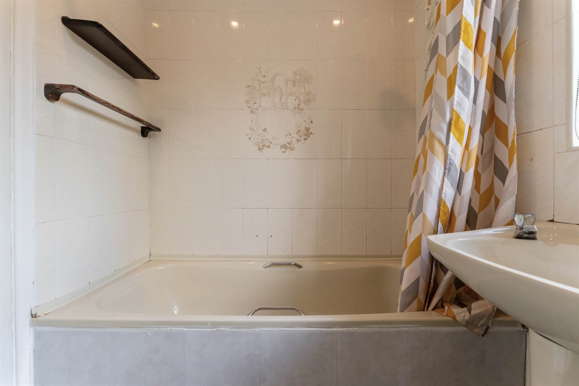 Coloured suite comprising, low flush WC, pedestal wash hand basin with chrome taps, vinyl flooring, panelled bath with chrome tap, electric shower, fully tiled walls, frosted glass window