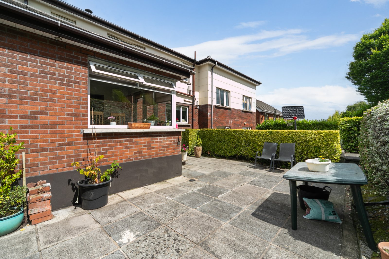 To the rear is a yard patio area with terraced garden. 3 terraced levels with gardens and hedging . Double skin oil tank.