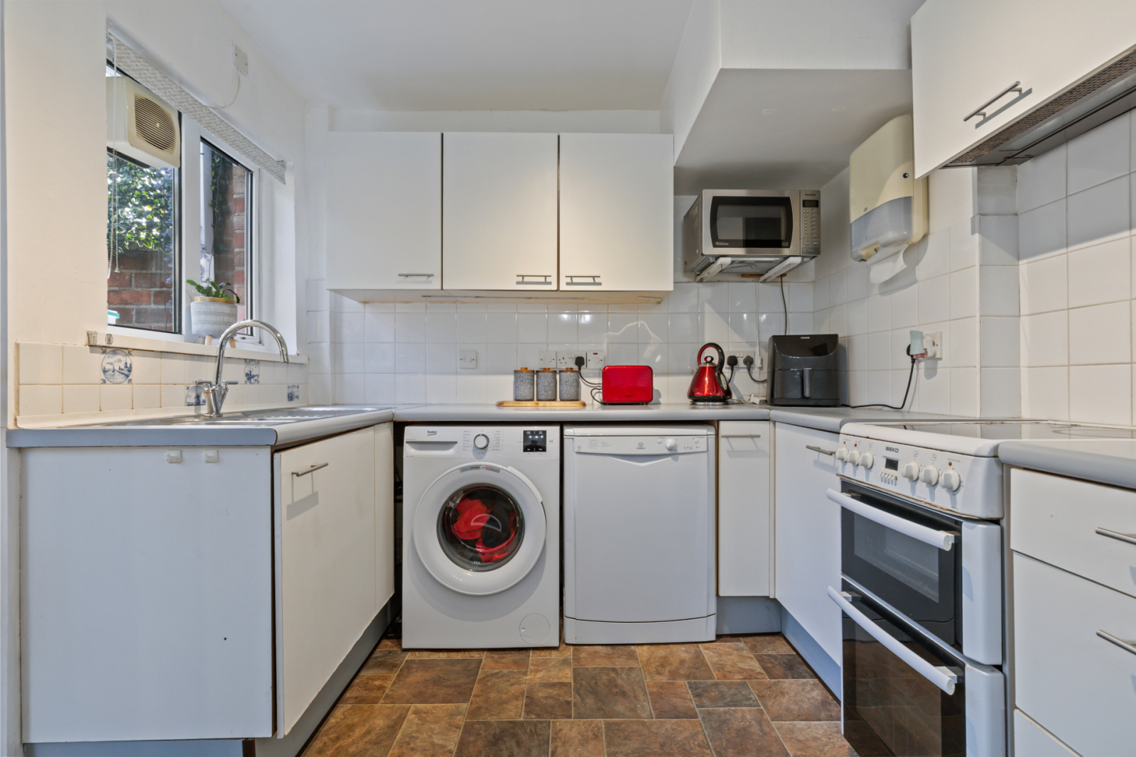Full range of high and low level units, recess for cooker, plumbed for dishwasher, plumbed for washing machine, stainless steel single drainer 1.5 bowl sink unit with mixer taps, partly tiled walls.