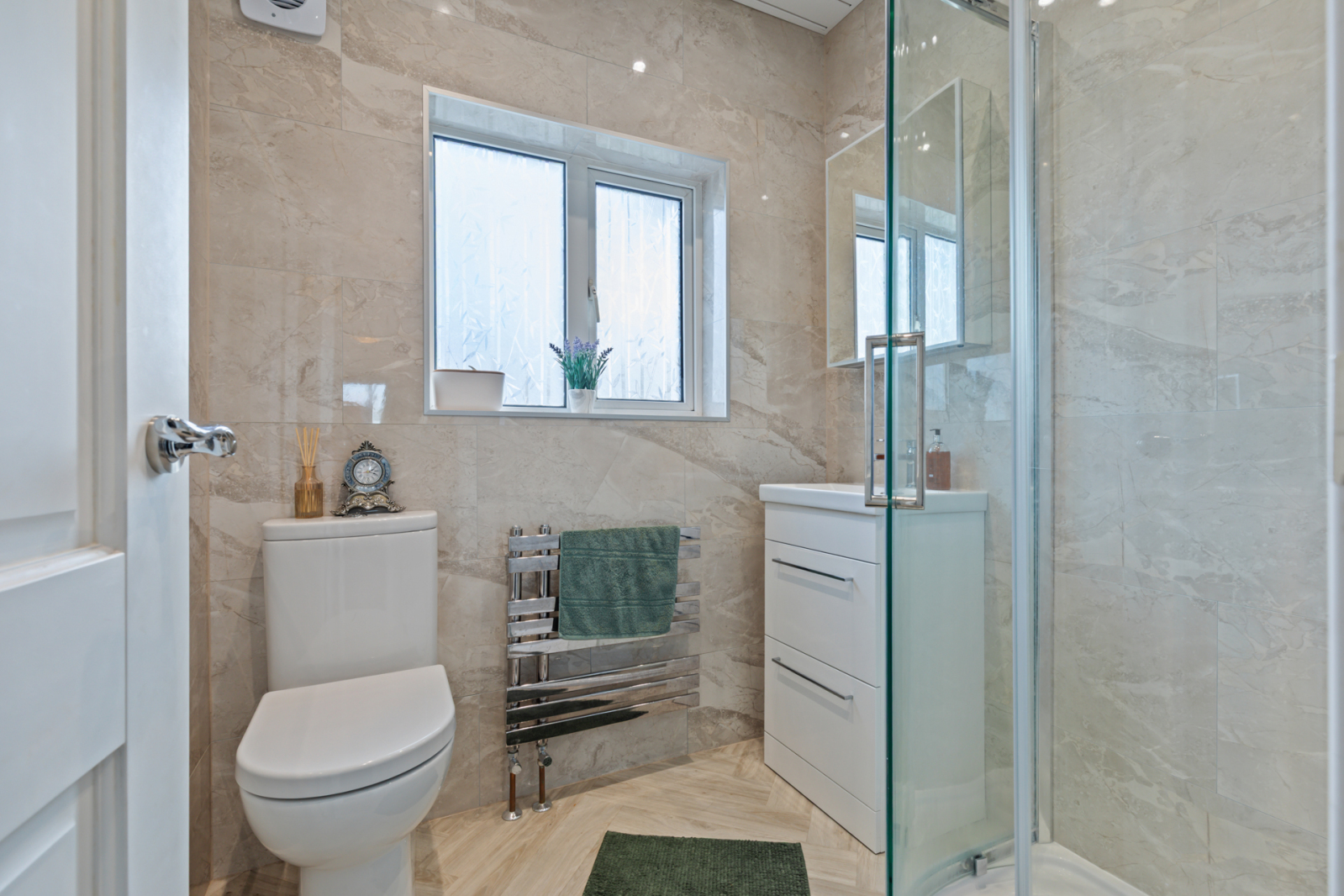 Fully tiled shower cubicle, instant heat electric shower, vanity sink unit, low flush WC, fully tiled walls, chrome towel radiator.
