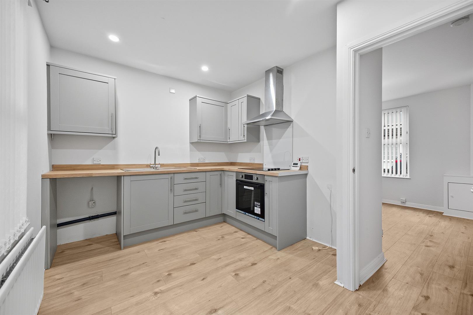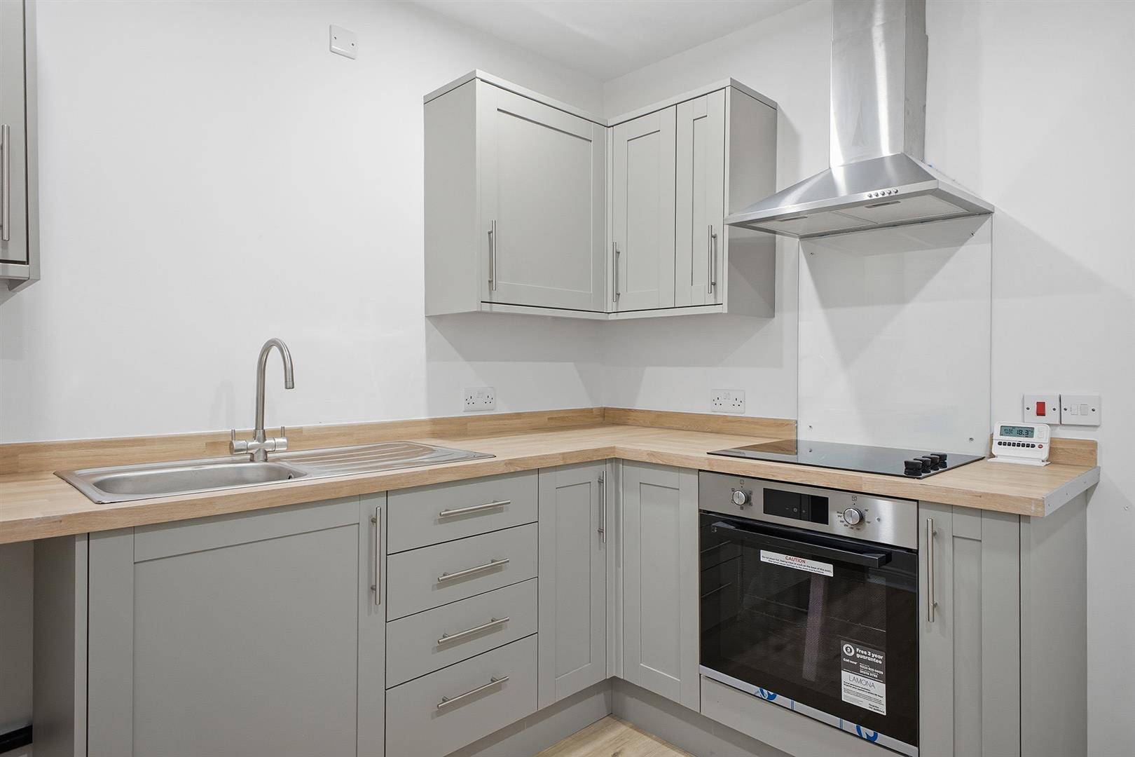 Shaker style L-shaped kitchen with laminate flooring, recess spotlights, Lamona electric hob and oven under and extractor fan. Plumbed for white goods.