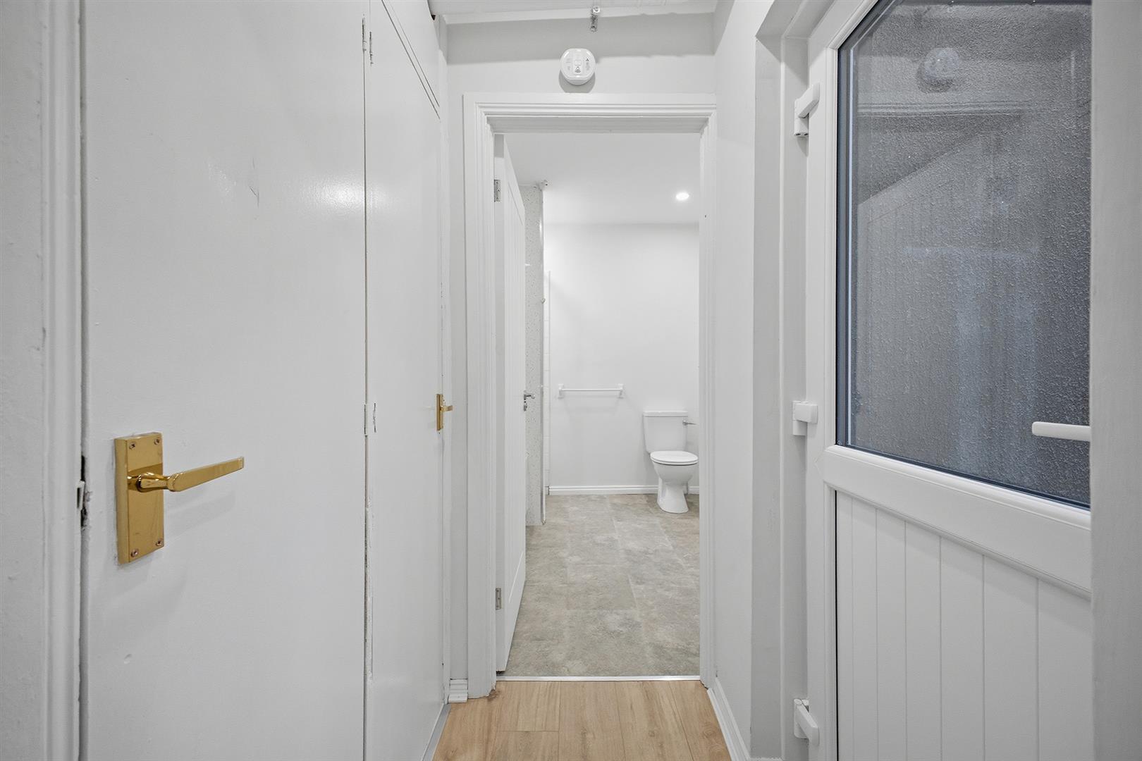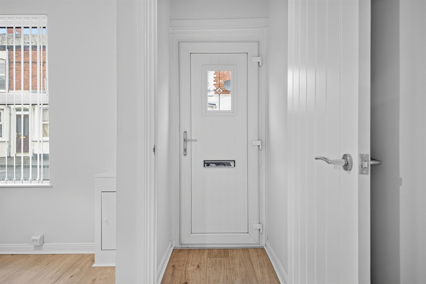 Composite front door with laminate wood effect flooring leading to...