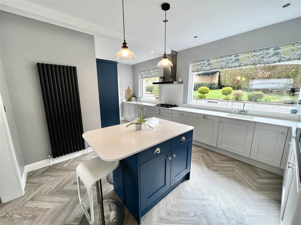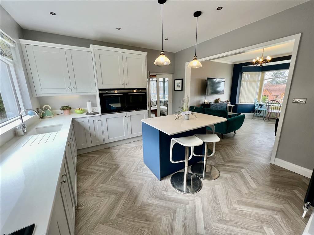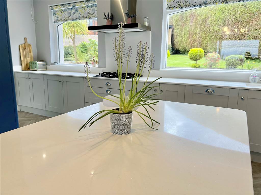 Range of high and low level units with quartz worktops. Built in Nordemende, oven, plate warmer, microwave, 5 ring hob and dishwasher, Feature larder cupboard. Kitchen Island.