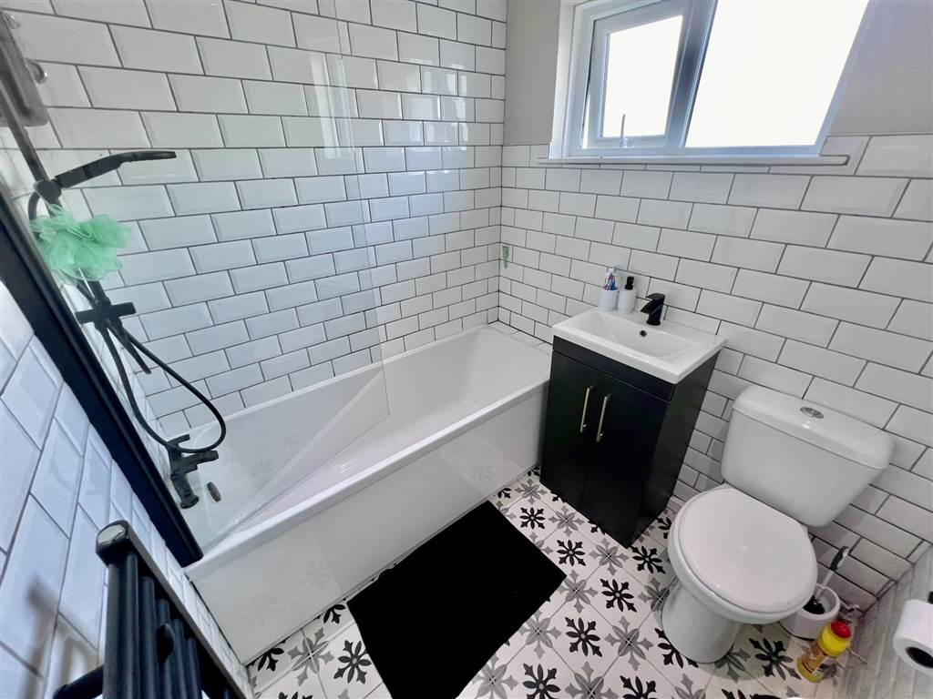White suite : Panel bath, dual flush w.c, pedestal wash hand basin. Tiled floor. Tiled walls.