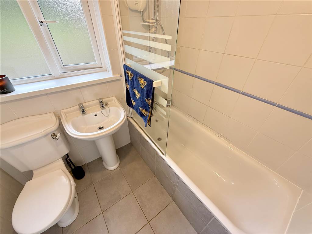 White suite : Panel bath with overhead electric shower, low flush w.c, pedestal wash hand basin. Tiled floor. Part tiled walls.