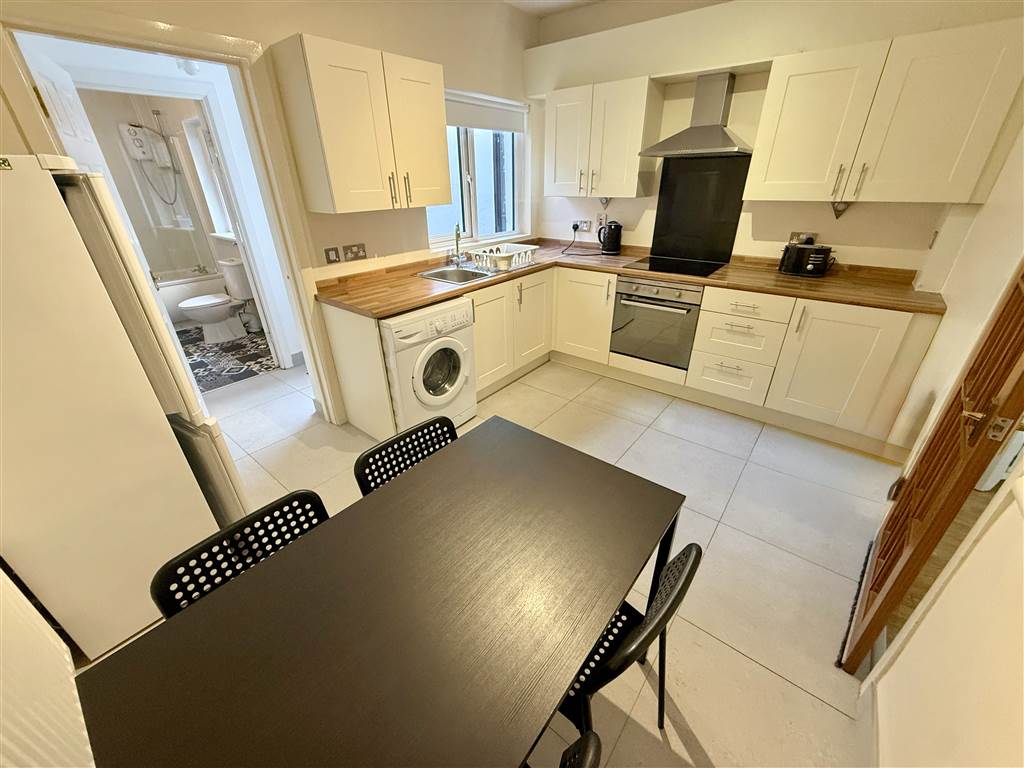 Range of high and low level units with wood effect worktops. Plumbed for washing machine. Stainless steel sink with drainer. Part tiled walls. Extractor fan. Spot lighting.