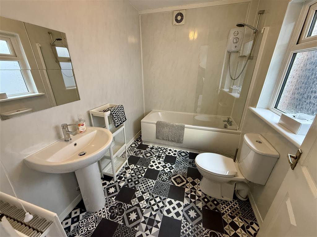 White suite: Panel bath with overheah electric shower. Dual flush w.c. Pedestal wash hand basin.