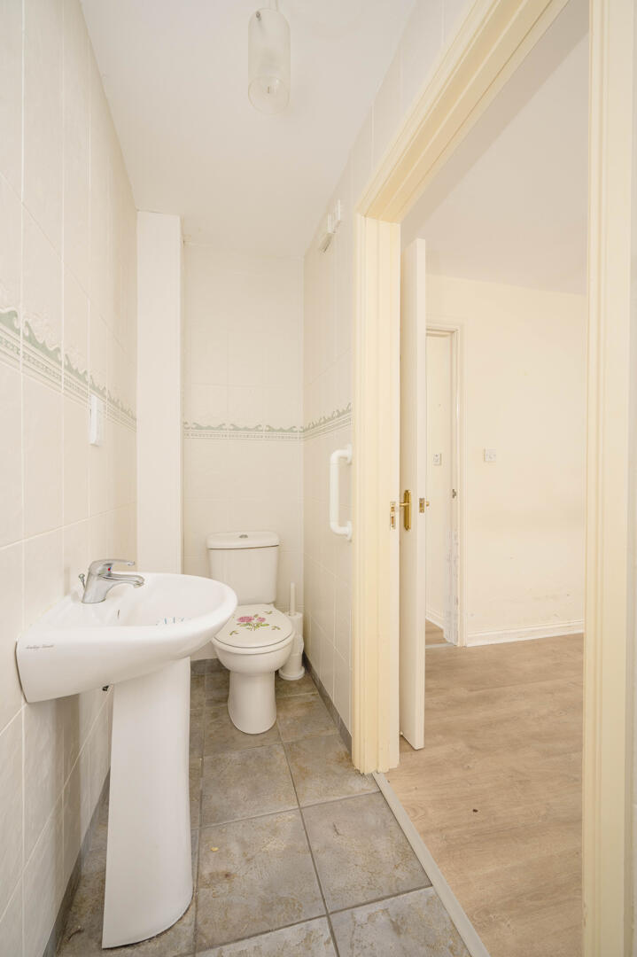 White suite comprising low flush WC with push button, pedestal wash hand basin with chrome mixer taps, open shower cubicle with thermostatically controlled valve and telephone hand unit, fully tiled walls, ceramic tiled floor, extractor fan.