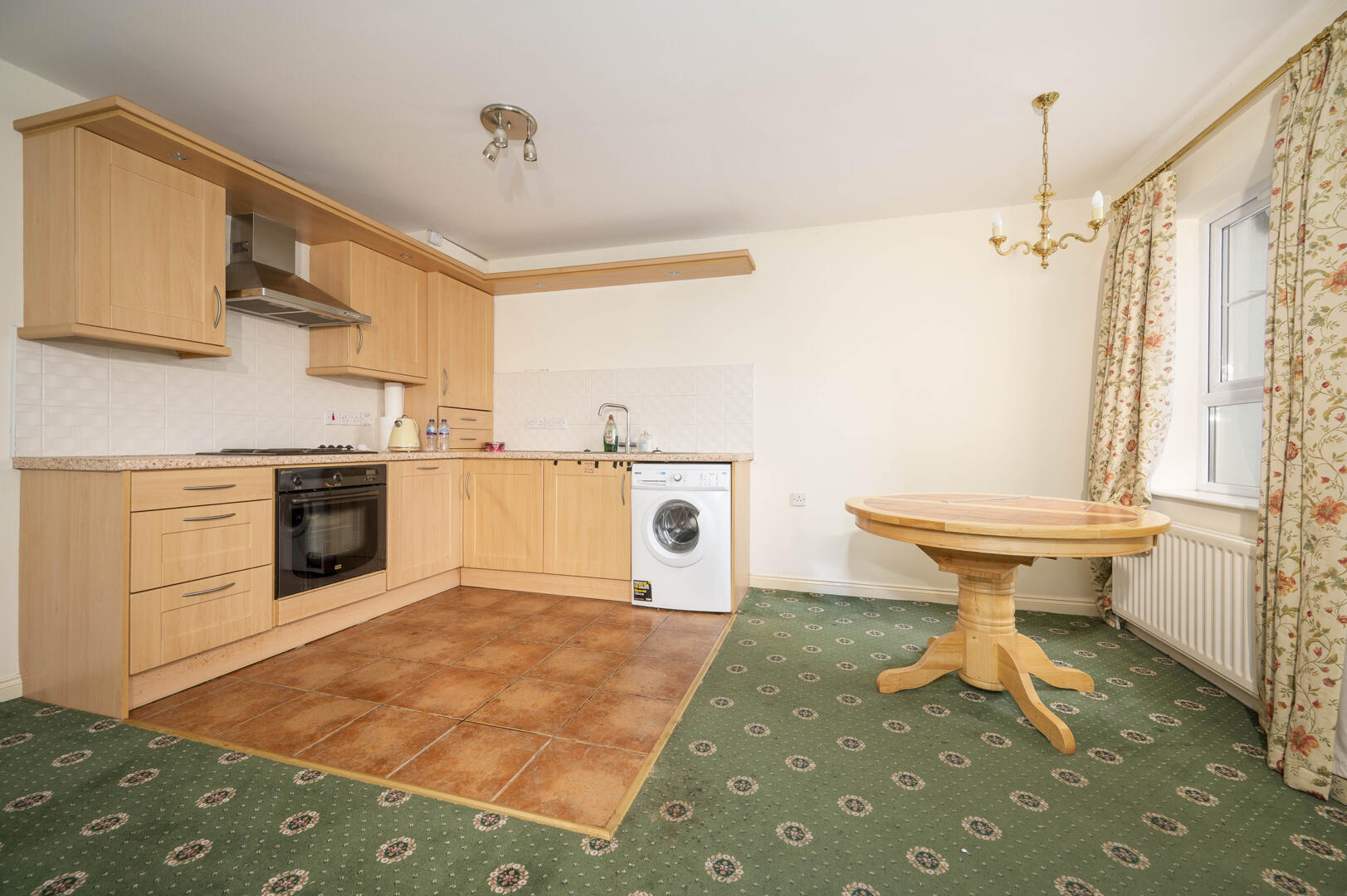 Kitchen with excellent range of high and low level units, stainless steel fittings, laminate worktop, stainless steel sink and a half with chrome mixer tap, built-in low level oven, four ring electric hob, stainless steel extractor above, part tiled walls, plumbed for washing machine, space for fridge freezer, under counter low voltage recessed spotlighting, ceramic tiled floor, open to living and dining space, uPVC double glazed French doors to front paved area.