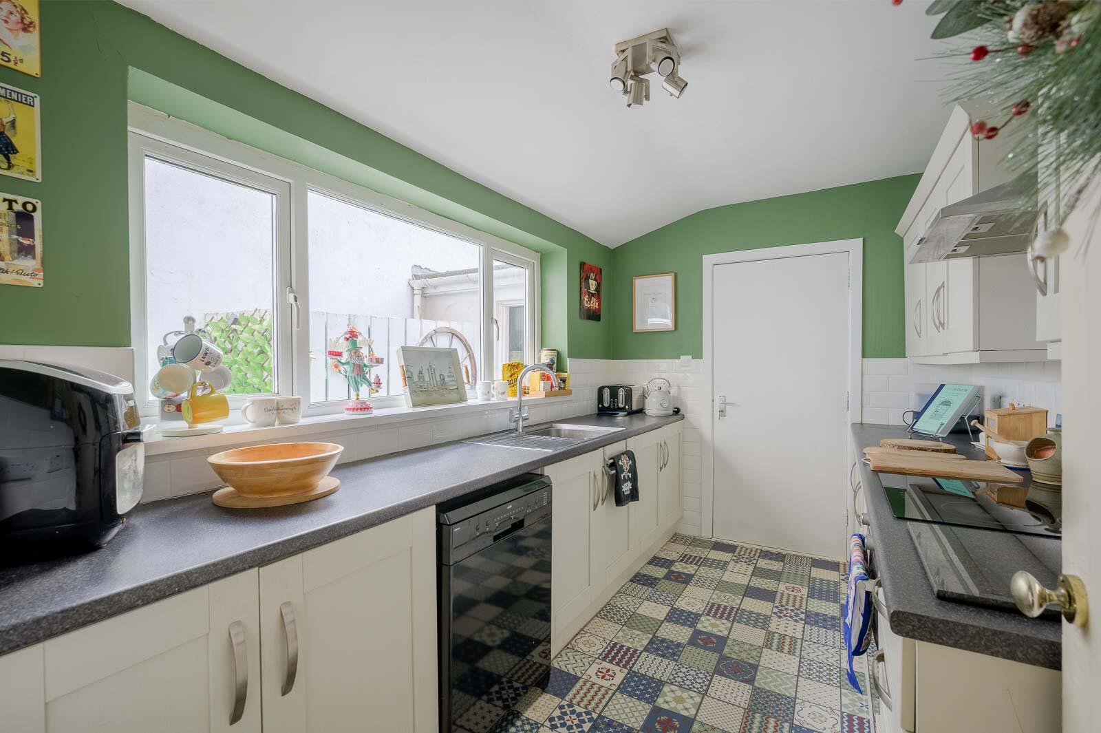 With fridge freezer space, plumbed for washing machine, tumble dryer space, oil boiler, Velux window, access to rear yard and access to alleyway.