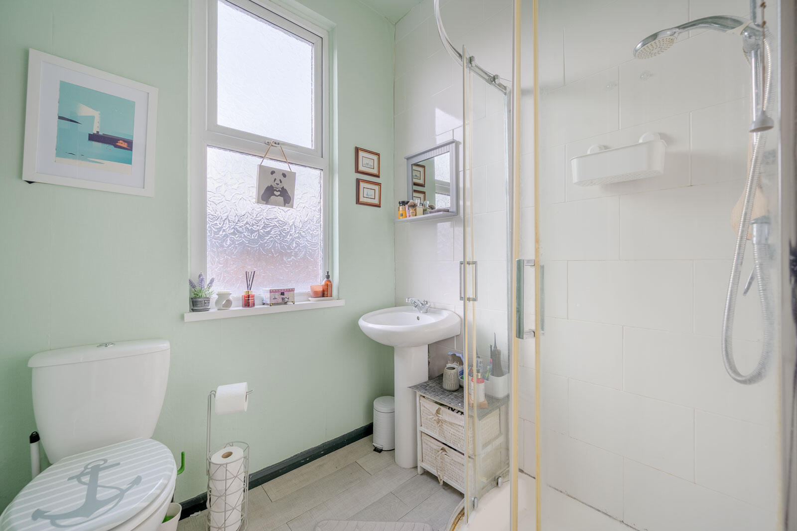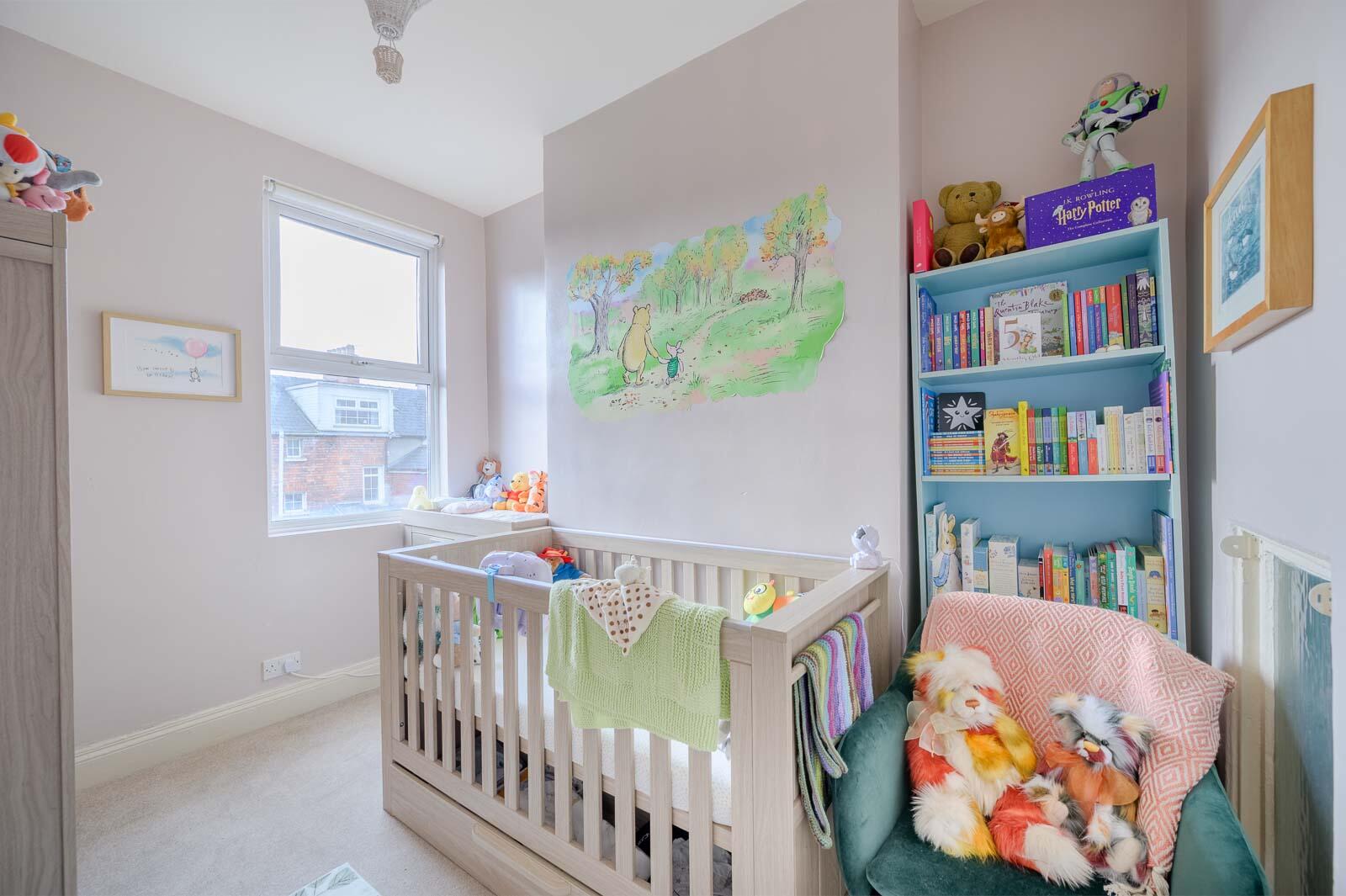 The first floor hosts two beautifully presented bedrooms, including a generous primary bedroom with soft, neutral tones creating a calm retreat. A charming nursery room sits nearby, thoughtfully decorated and filled with light. This level also benefits from a bright family shower room.