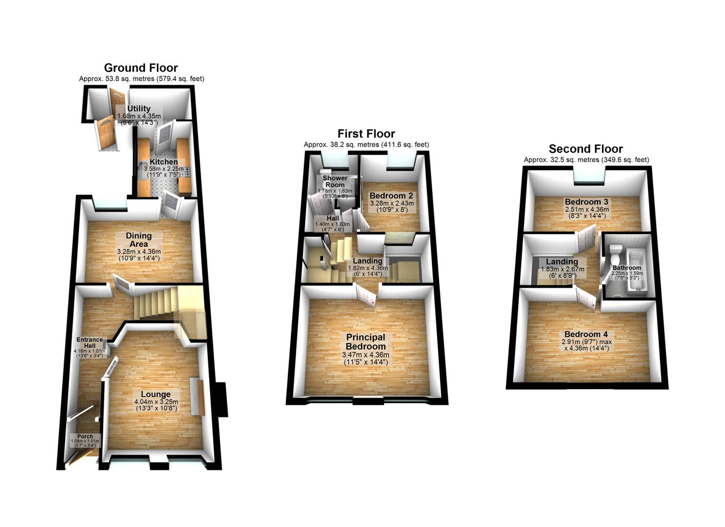 Spacious four-bedroom, three-storey layout offering excellent flexibility for modern living.