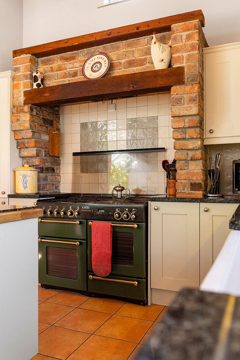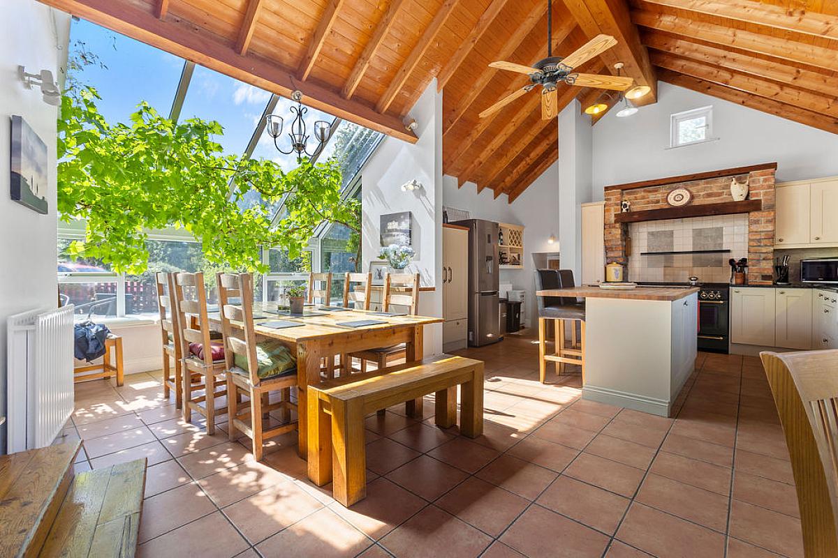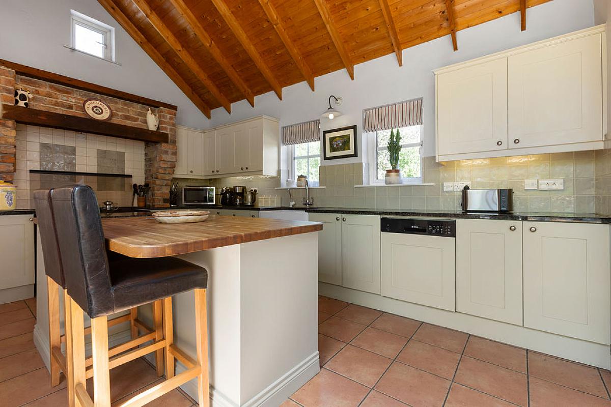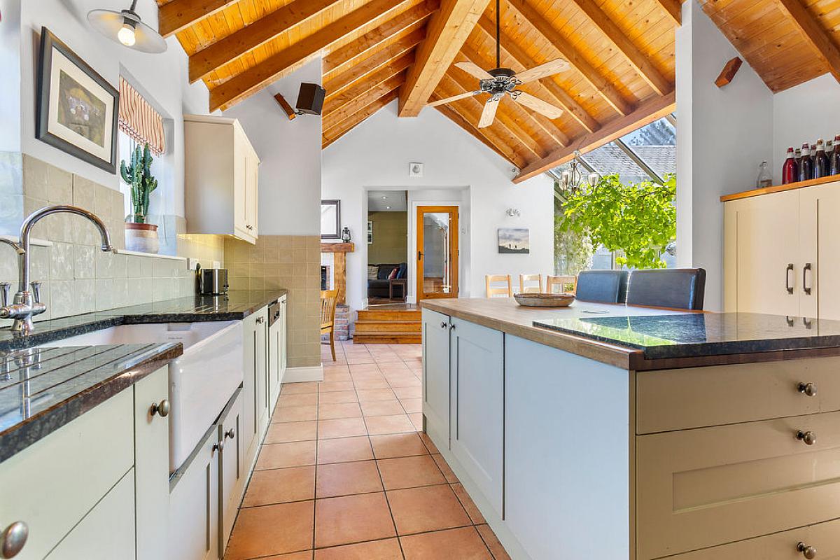 Tiled floor with part tiled walls and vaulted ceiling. High and low level storage units with granite and wooden worktops, island with storage and electrical points. Integrated dishwasher and space for range cooker in feature brick surround. Belfast sink and space for fridge freezer. Sitting area with Inglenook wood burning stove with feature brick surround and wooden mantel. Overlooking gardens.