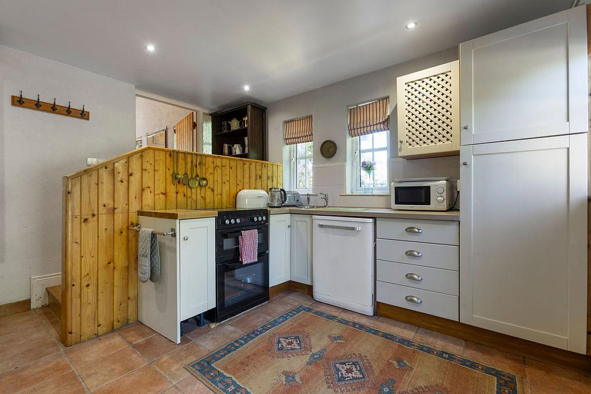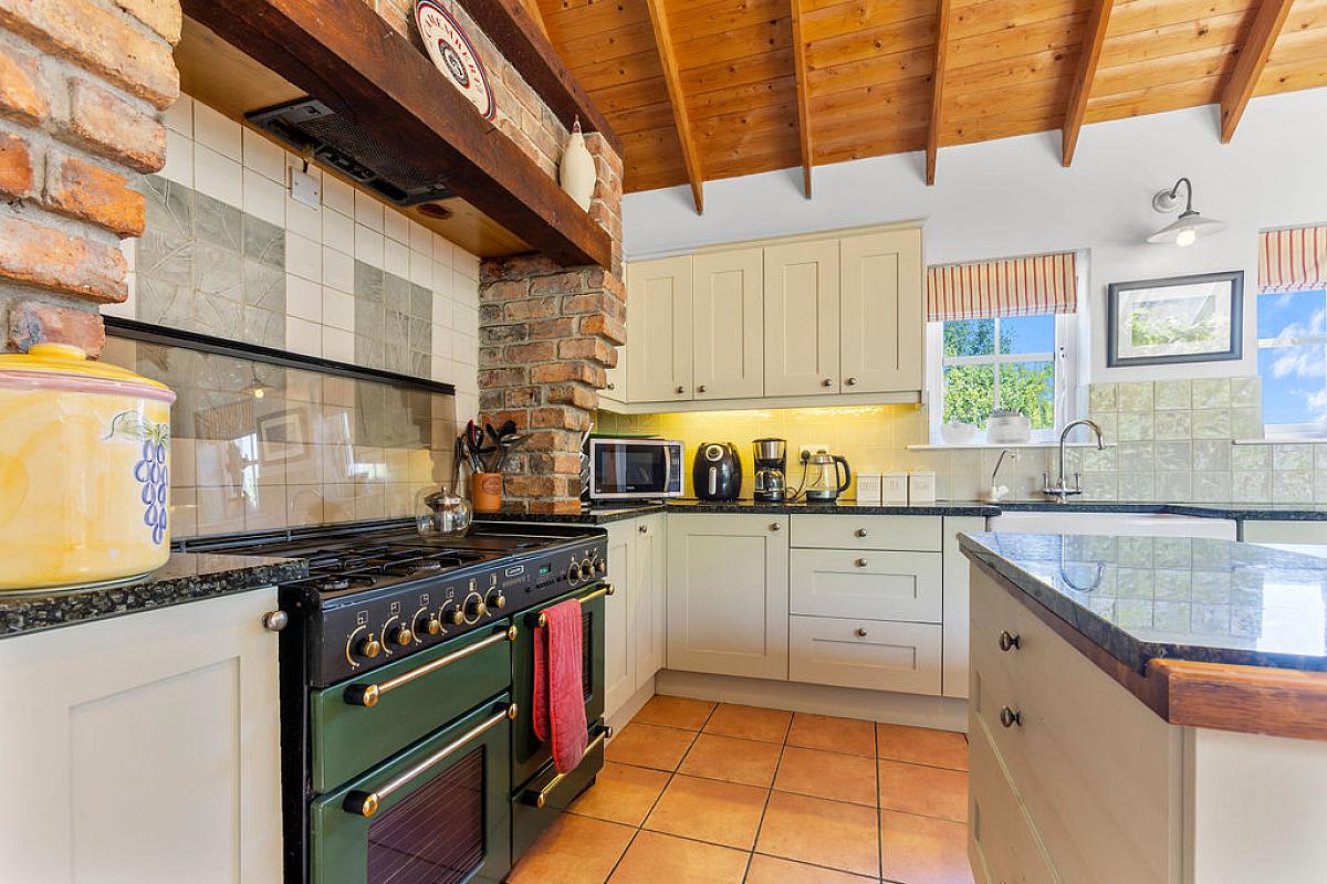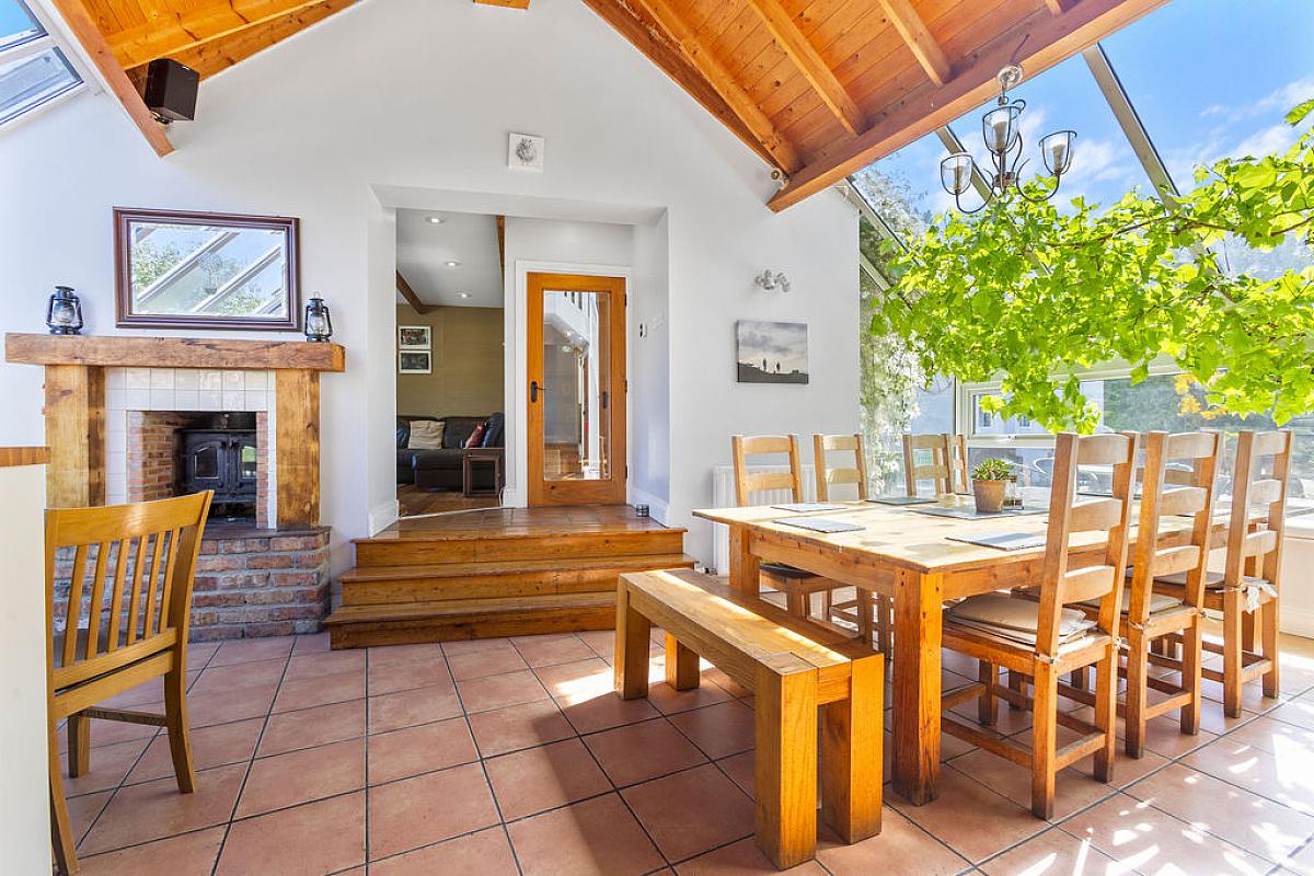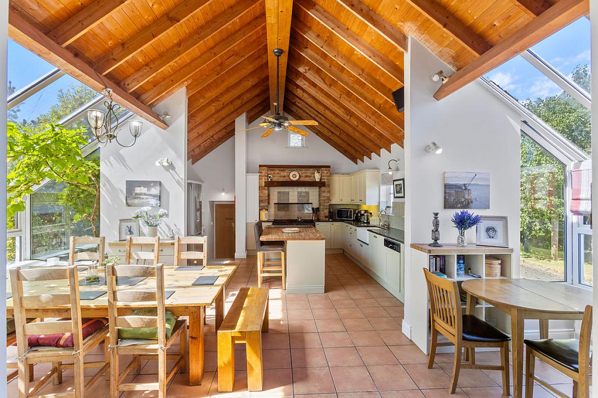Tiled floor with part tiled walls and vaulted ceiling. High and low level storage units with granite and wooden worktops, island with storage and electrical points. Integrated dishwasher and space for range cooker in feature brick surround. Belfast sink and space for fridge freezer. Sitting area with Inglenook wood burning stove with feature brick surround and wooden mantel. Overlooking gardens.
