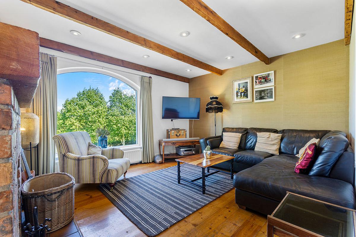 Solid wood floor with inglenook wood burning stove and wood beam mantel. Television point, exposed beams and built in storage. Steps down to kitchen.