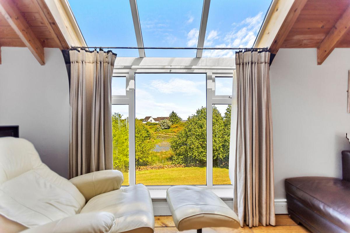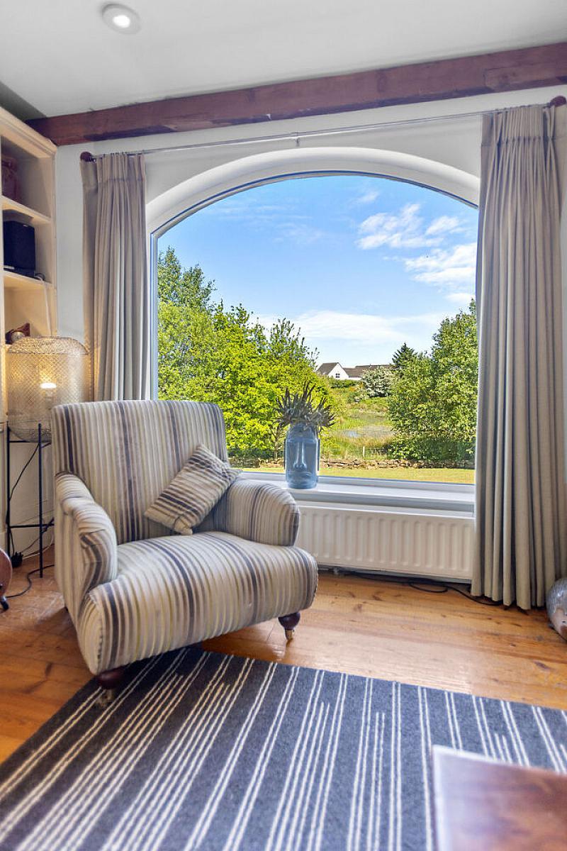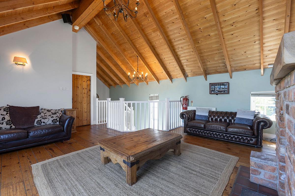 Solid wood floor, gas fire with feature brick fireplace and wooden mantel. Vaulted ceiling and walls lights. Large feature window with views over gardens and lake.