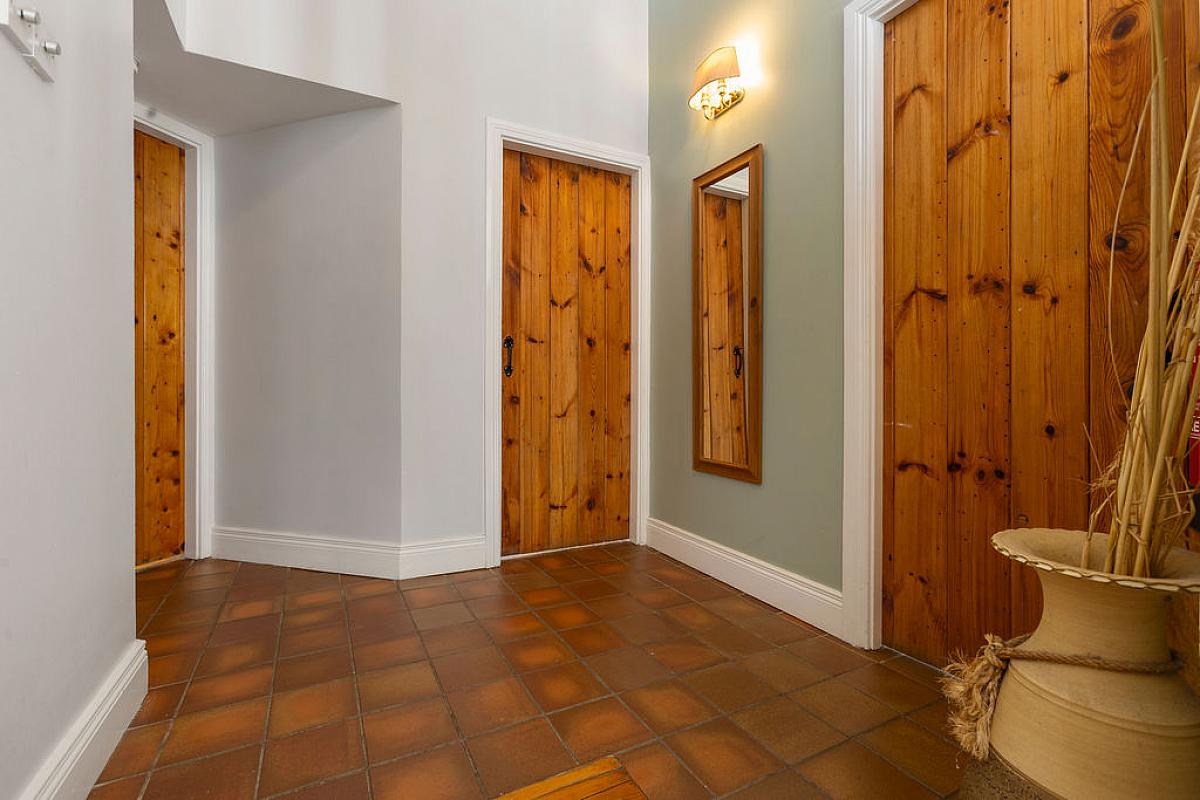 Tiled floor with glass panel front door.