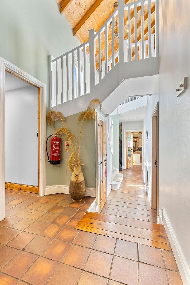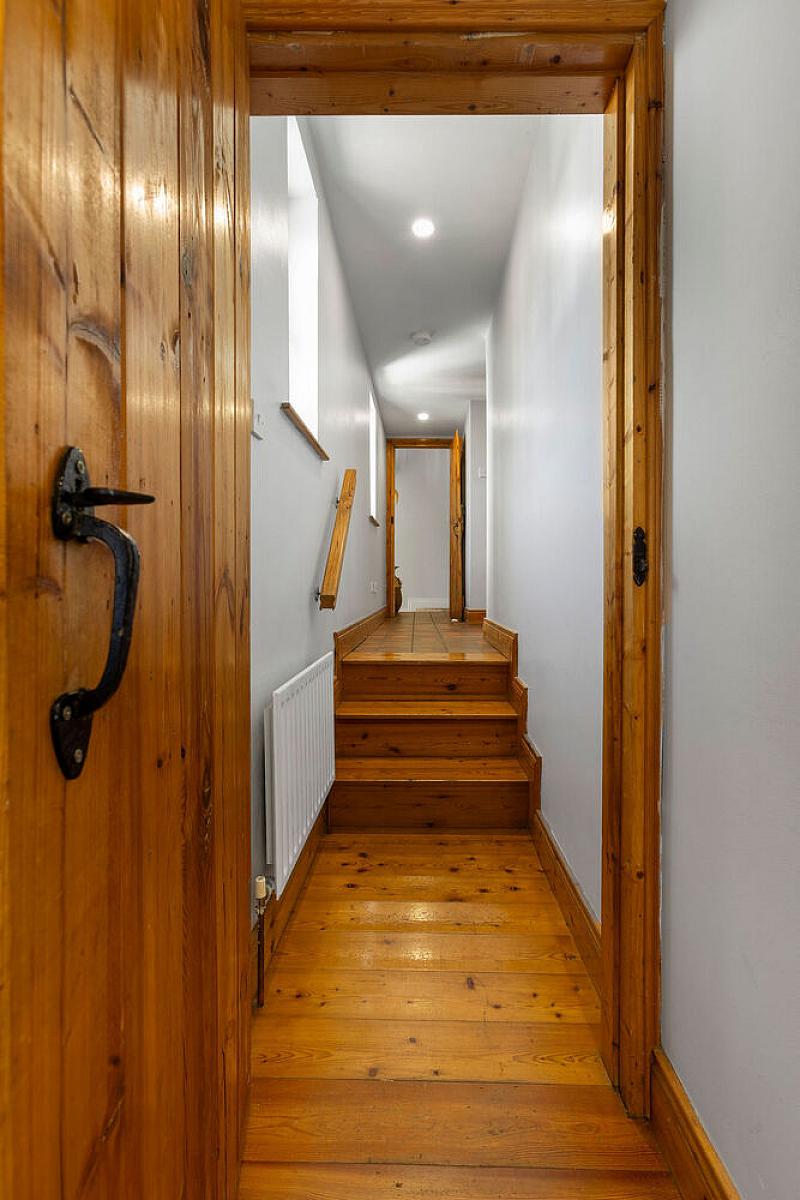 Tiled floor, wall lights and vaulted ceiling. Under stair storage and shelved hot press.