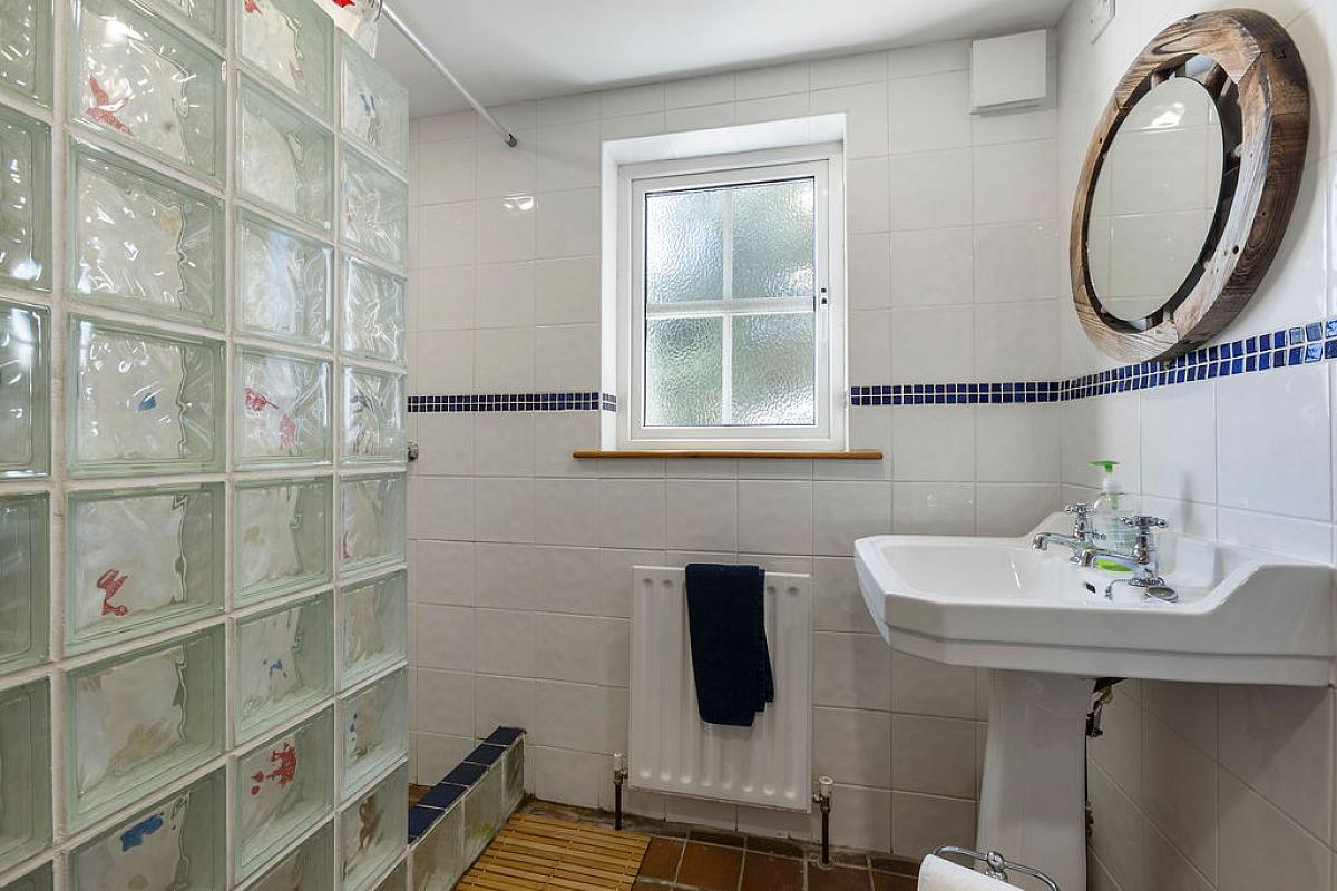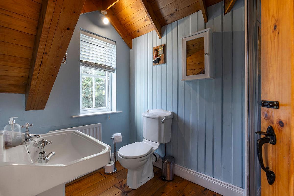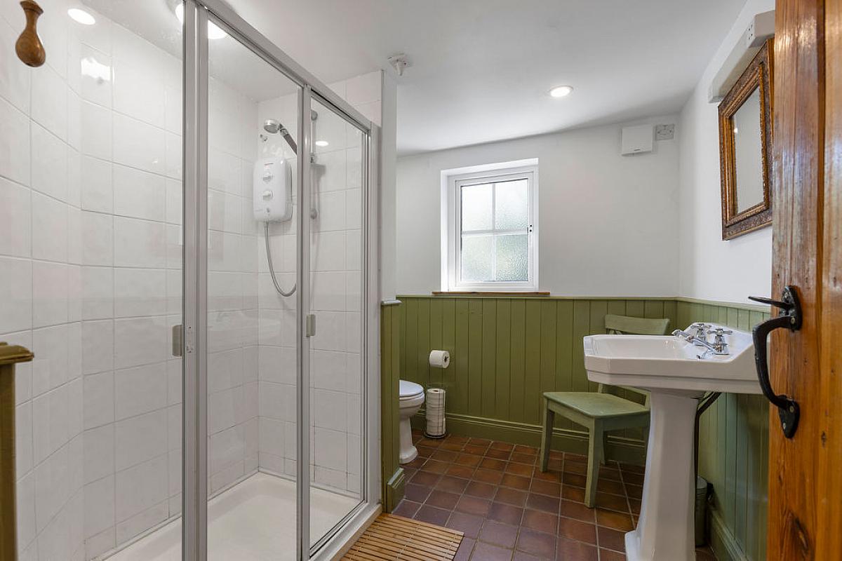 Solid wood floor with tiled shower cubicle and mains shower. Low flush WC and wash hand basin. Wood panelling to walls.