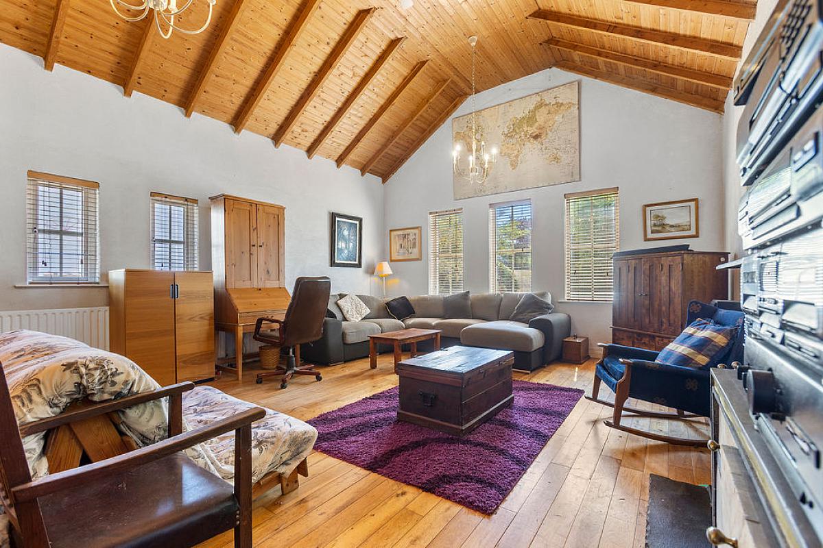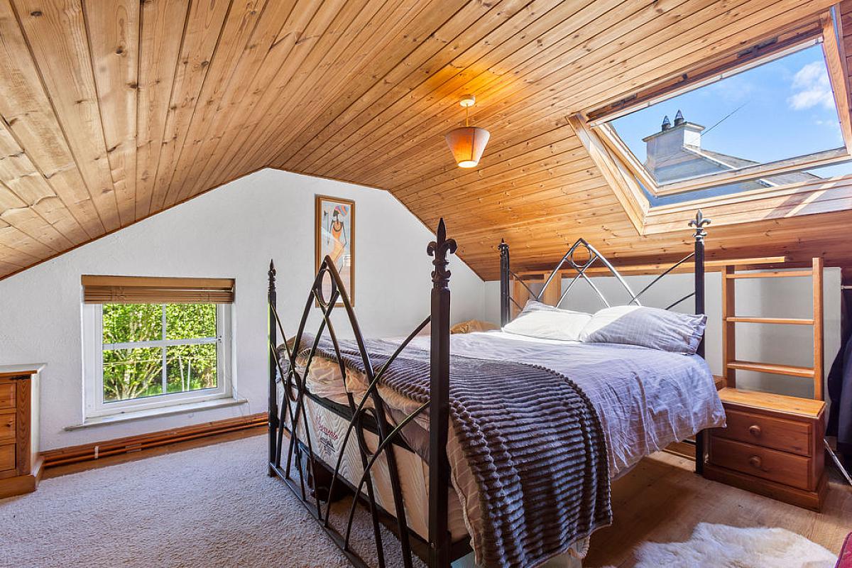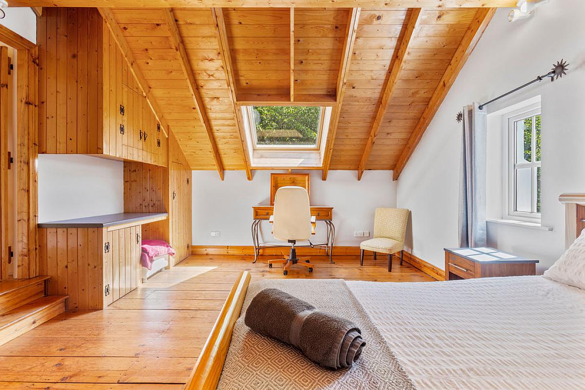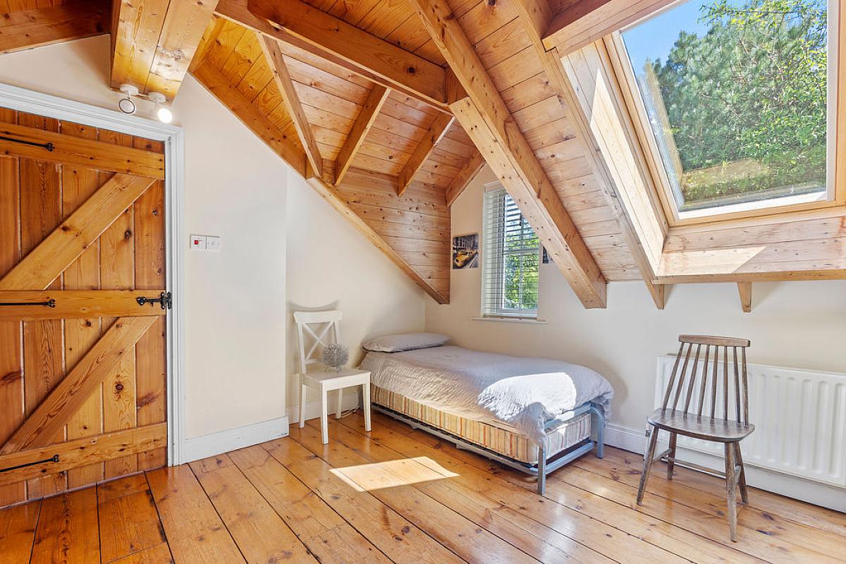 Solid oak floor. Vaulted ceiling and built in storage. Dual aspect with staircase to first floor bedroom.