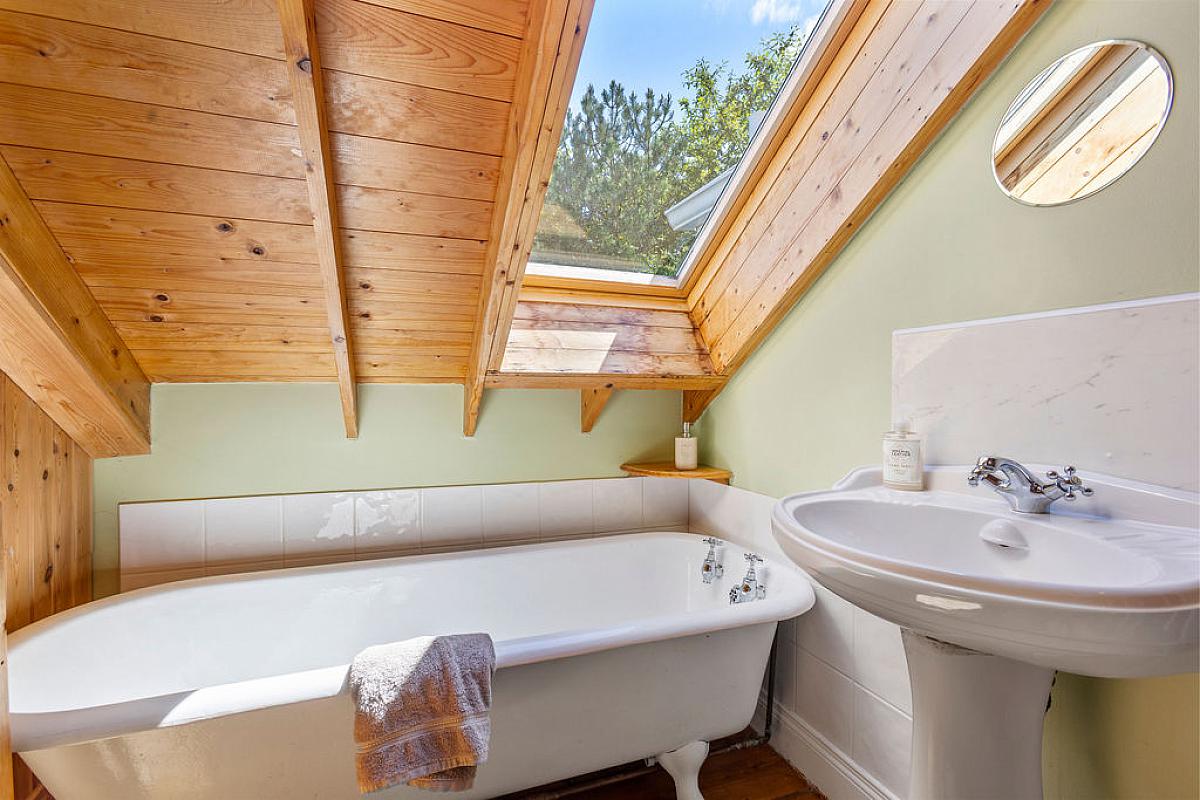 Comprising roll top cast iron enamelled bath, tiled shower cubicle with mains shower, low flush WC and wash hand basin.