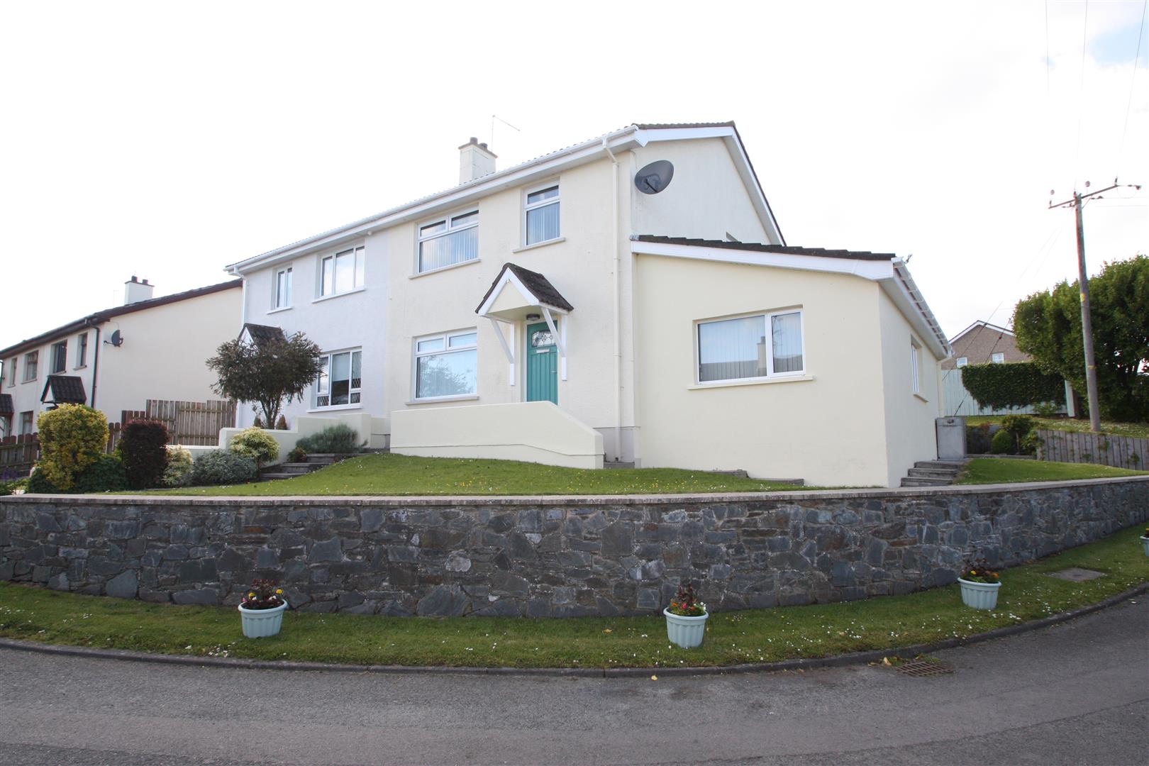 Garden to front laid to lawn, mature planting, stone feature wall.