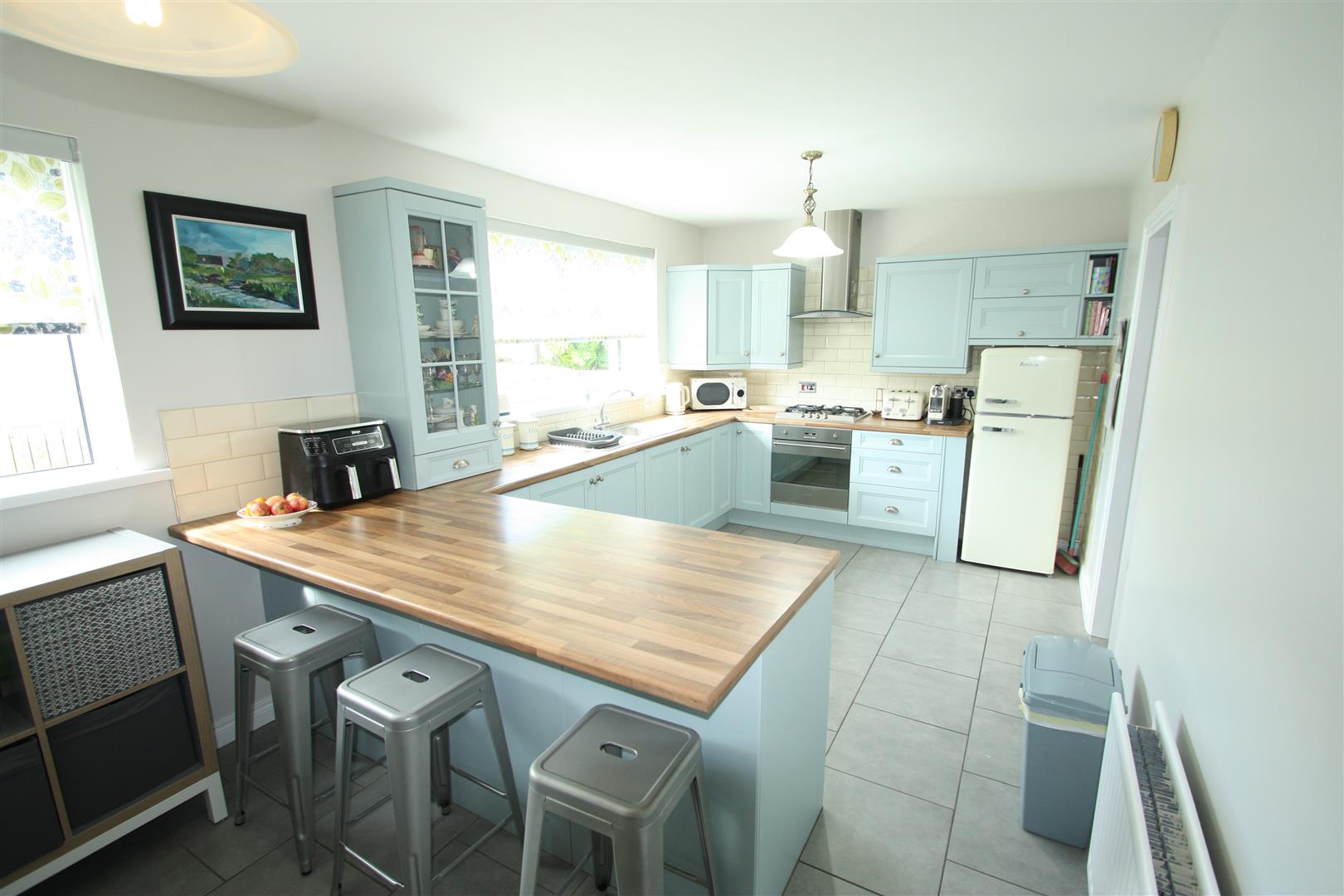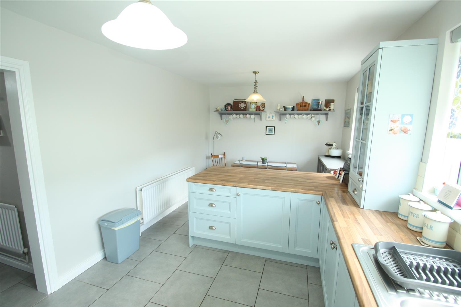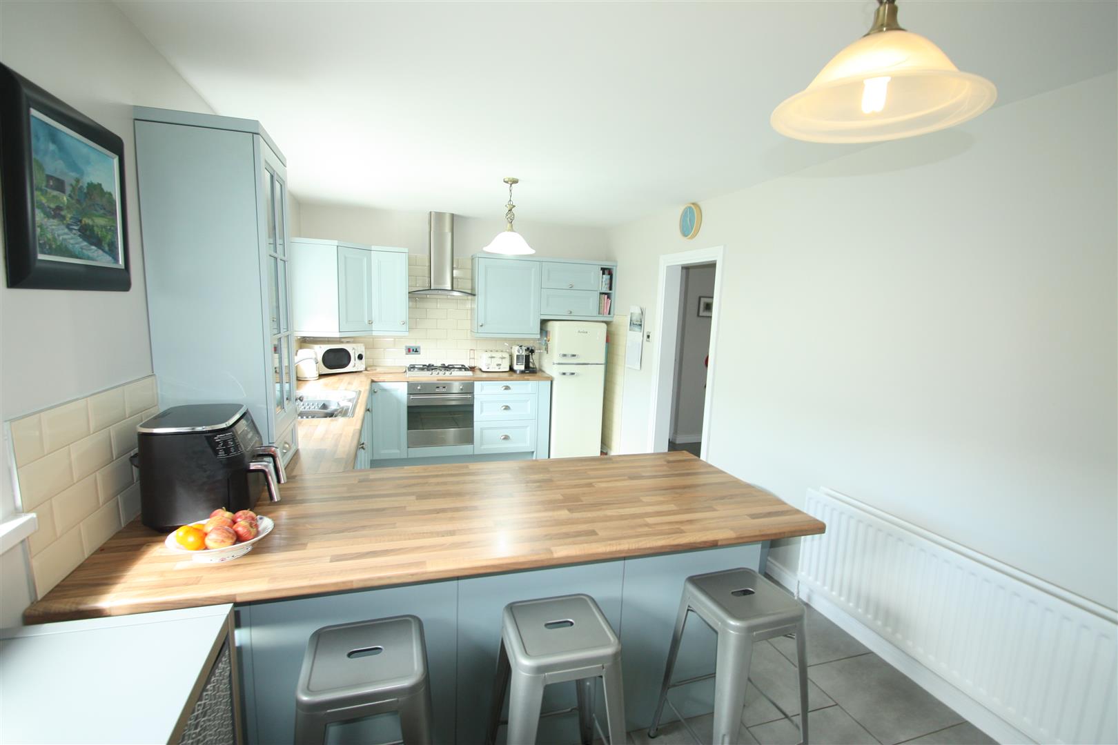 Range of high and low level units incorporating built in oven, with gas hob, stainless steel cooker hood with extractor fan, stainless steel splashback, glass fronted display cupboard, breakfast bar, stainless steel sink unit and a half, space for fridge/freezer, tiled walls and tiled flooring, dining area.