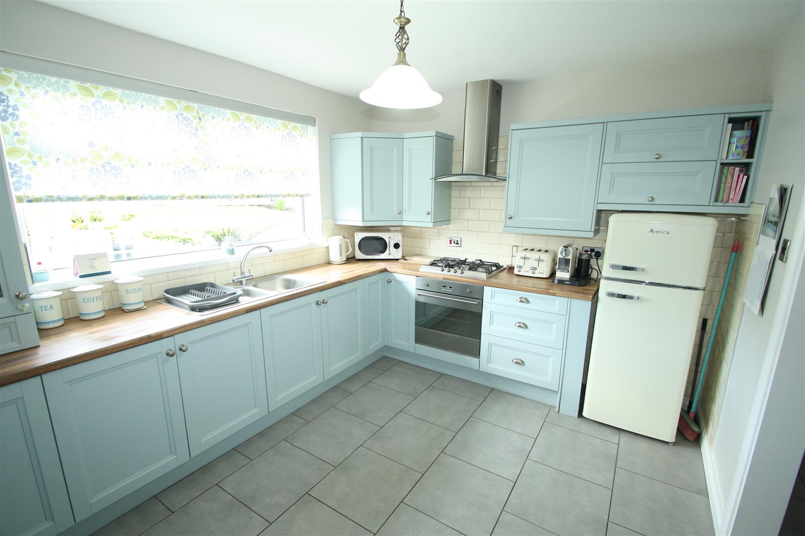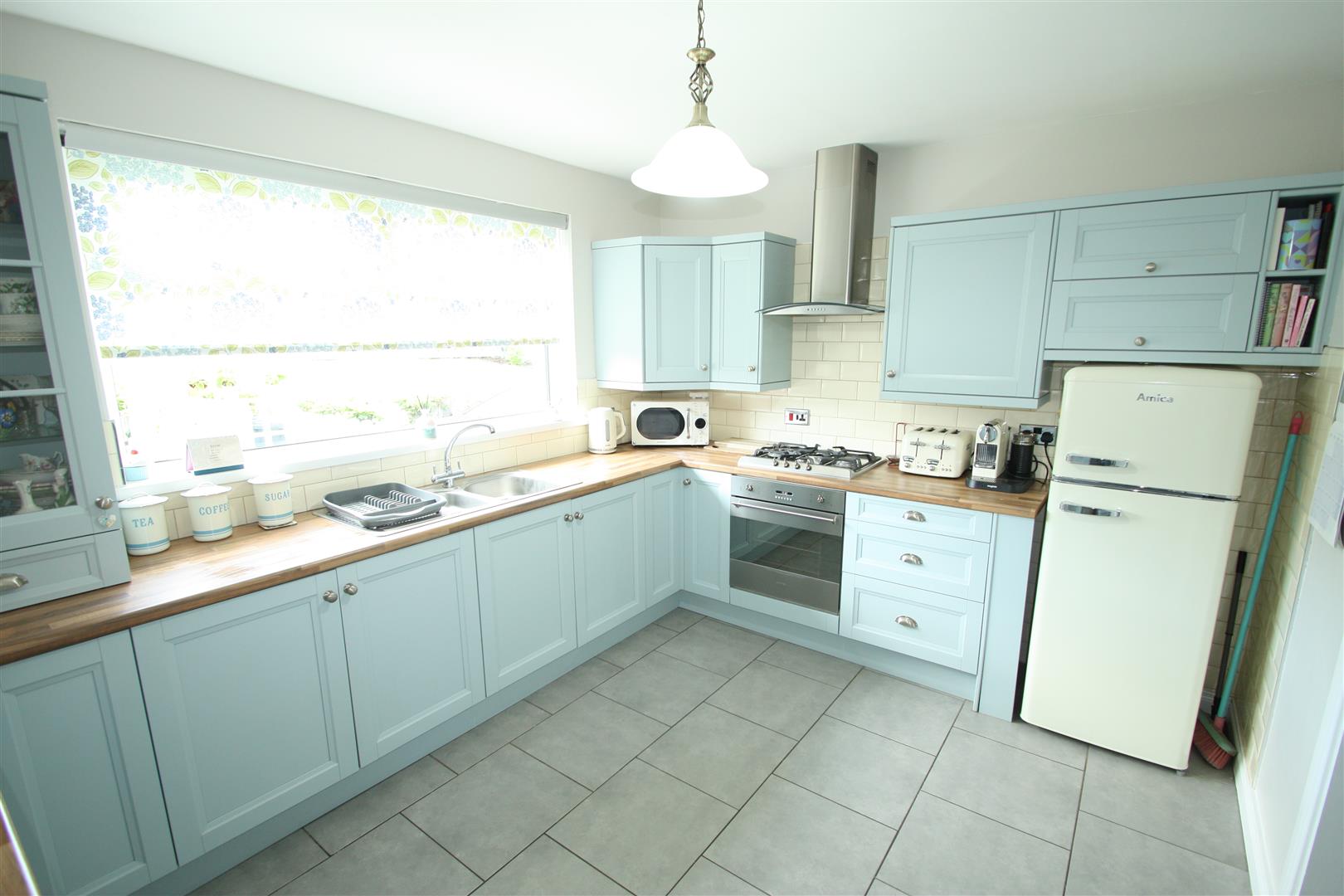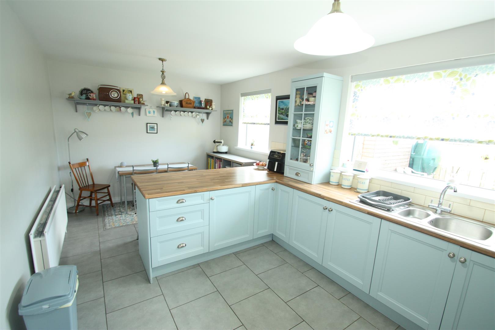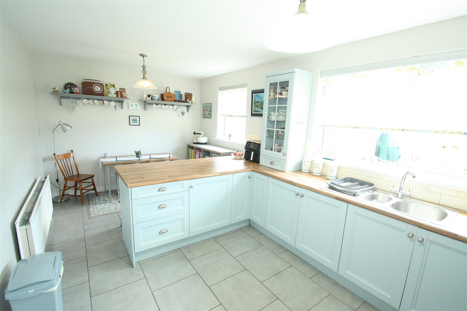Range of high and low level units incorporating built in oven, with gas hob, stainless steel cooker hood with extractor fan, stainless steel splashback, glass fronted display cupboard, breakfast bar, stainless steel sink unit and a half, space for fridge/freezer, tiled walls and tiled flooring, dining area.